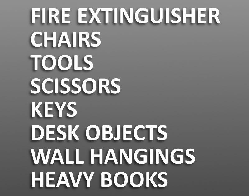 If you have time, look around for objects you can use as weapons and be committed to using them, if necessary. Almost every office, church, or classroom has items that can be used for protection. We’ve provided a list below. Take a few minutes to look it over.