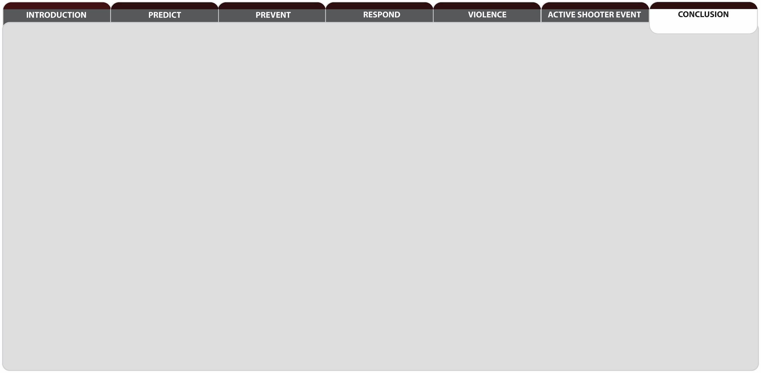 Copyright Safety Provisions, Inc. PREDICT PREVENT RESPOND VIOLENCE ACTIVE SHOOTER CONCLUSION