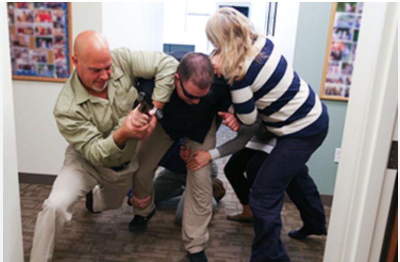 The first step to take if you are in this situation is to try to remain calm. Many people who thought they could never defend themselves or others have done so when needed. You can, too. Remember your survival mindset: you MUST survive. Fully commit to defending yourself and others with physical action. If there are other people with you who do not wish to fight back, do not force them to do so.