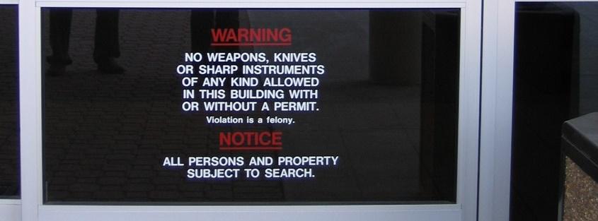 There are no federal laws governing weapons in a private workplace. However, some states or provinces and local jurisdictions do have restrictions on them. Make yourself aware of all laws relevant to your situation, as well as any policies specific to your workplace. Adhere to these laws and policies with exactness.