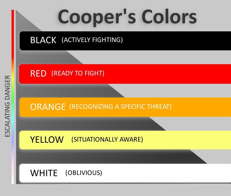 The Cooper Color Code, sometimes referred to as just Cooper’s Colors, has been used in the military and law enforcement world for decades. We present it here to give you an idea of your own awareness levels from day to day.