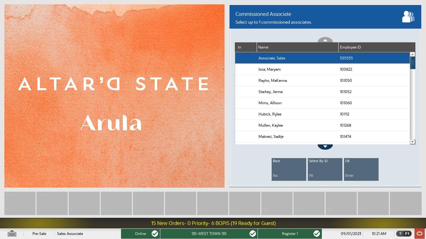 Ask the guest if anyone helped them today, click on the highlighted associate to clear the name, scroll to the commissioned associate and press enter.