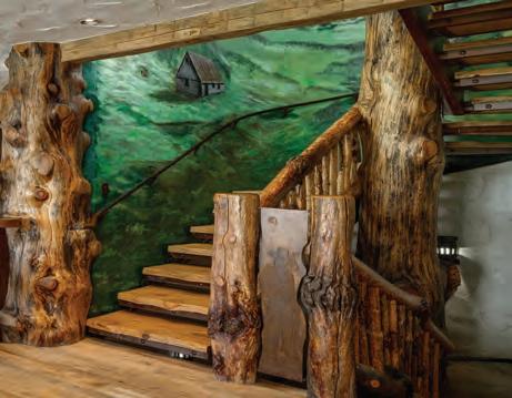 One of the details not specified on the plans was the staircase. We insisted on large steps necessitating a spiral staircase and came up with the idea of a tree coming up from the bottom to wrap a staircase around. How they found a tree and made the staircase fit around it is still a bit of mystery. An eagle was carved at the top and a bear at the bottom. The scene on the wall going down the staircase all came from the family ranch in the Elk River Valley. The room that may be our favorite in the whole house is one of the half bathrooms that represents an elevated out-house. With rutic wood paneling, a “hole” where the toilet is, unique rusted metal finishes and again huge boulders that makes the sink look like it’s built into the rock, it’s probably the most unique bathroom in Steamboat.