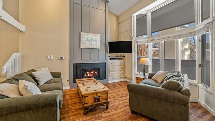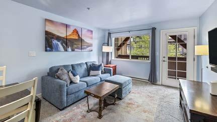 Updated 2 BD, 2 BA condo in the green zone for short-term rentals with new paint, flooring, and countertops. Features ski-in access, walk-toslope ease, gas fireplace, and a private deck with gondola views.