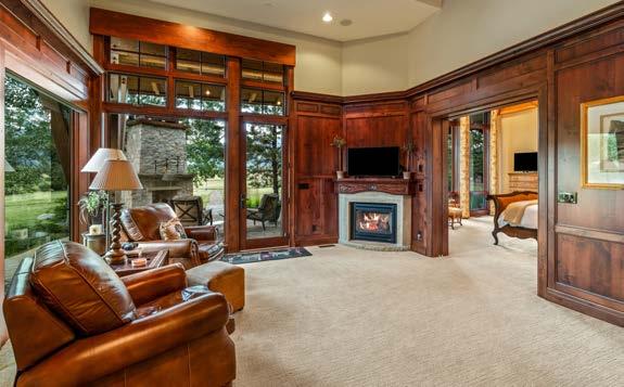 The primary wing of the home offers privacy, tranquility, and sweeping views of the hay meadows and South Valley mountains. With the ability to be closed off from the rest of the home, this wing becomes a true sanctuary. Inside, the primary features 2 fireplaces framed with custom timber and sandstone. The bedroom is a retreat of serenity and security, complete with a custom stone wall and a cozy fireplace. The five-piece bath includes a soaking tub overlooking the meadows, a steam shower, and access to a washer, dryer, utility sink, and a grand two-story dressing room with custom built-ins. Abundant windows and doorways fill each room with natural light and connect seamlessly to the outdoors. The office opens to an outdoor fireplace and seating area with pathways for morning walks, while a private stone patio off the suite features a steel-encased hot tub that reflects the night sky.