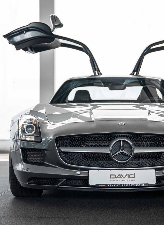 as bei DAVID Finest Sports Cars im ehemali gen Willy-Tiedtke-Gebäude in Hamburg-Wandsbek an jeder Ecke spürbar wird, ist eine grenzenlose Faszination für leistungsfähige Sportwagen und die uneingeschränkte Hingabe für echte Klassiker. Aktuell sind in dem 2000 Quadratmeter großen, lichtdurchfluteten Showroom rund 10.000 PS und Raritäten wie der Ferrari 430 Scuderia Spider 16M ausgestellt. Geschäftsführer und Gründer Benjamin David präsentiert seine hochexklusive Auswahl am liebsten farblich sortiert – vom Porsche 964 Kurven jäger bis hin zum Mercedes SLS AMG Coupé.