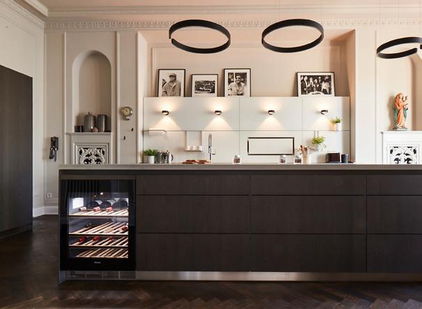 Minimalistisch und reduziert bildet die Wohnküche von KAH Küchen Atelier Hamburg einen Gegenpol zu den floralen Ornamenten der Jugendstilvilla. Den zentralen Ort dieses Wohnraums bildet der monumentale Küchenblock, der zum Verweilen und Genießen einlädt. Das Spiel der Gegensätze wird bei diesem Projekt auch in der Wahl der Materialien fortgesetzt. So fungieren die industriell angehauchte Betonarbeitsplatte und die weiße Rückwand aus Glaspaneelen als starke Gegenspieler zu den warm anmutenden Echtholzfronten aus schwarzgrau gebeizter Eiche. Der reizvolle, optische Kontrast der Küche setzt sich in zahlreichen technischen Annehmlichkeiten fort, wie z.B. dem in die Rückwand integrierten Dunstabzug oder einem Weinklimaschrank, der das hochwertige Ambiente unterstreicht.