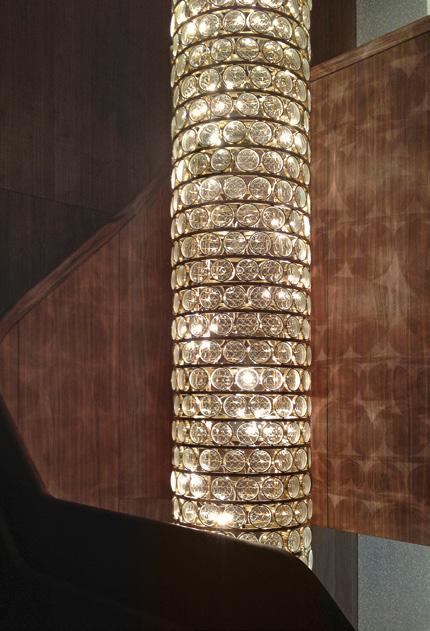 THE FONTENAY: Das organisch geformte Gebäude besteht aus drei ineinander verlaufenden Kreisen, die an große Baumkronen erinnern. Das gesamte Hotel ist lichtdurchflutet – eine vollkom mene Balance von Natur und Urbanität. Im Bild: Das gläserne Atrium mit 27 Metern Deckenhöhe. Das Prunkstück des Atriums ist die Lichtskulptur der niederländischen Firma Brand van Egmond mit 140 LEDs an gewundenen Stahlästen.