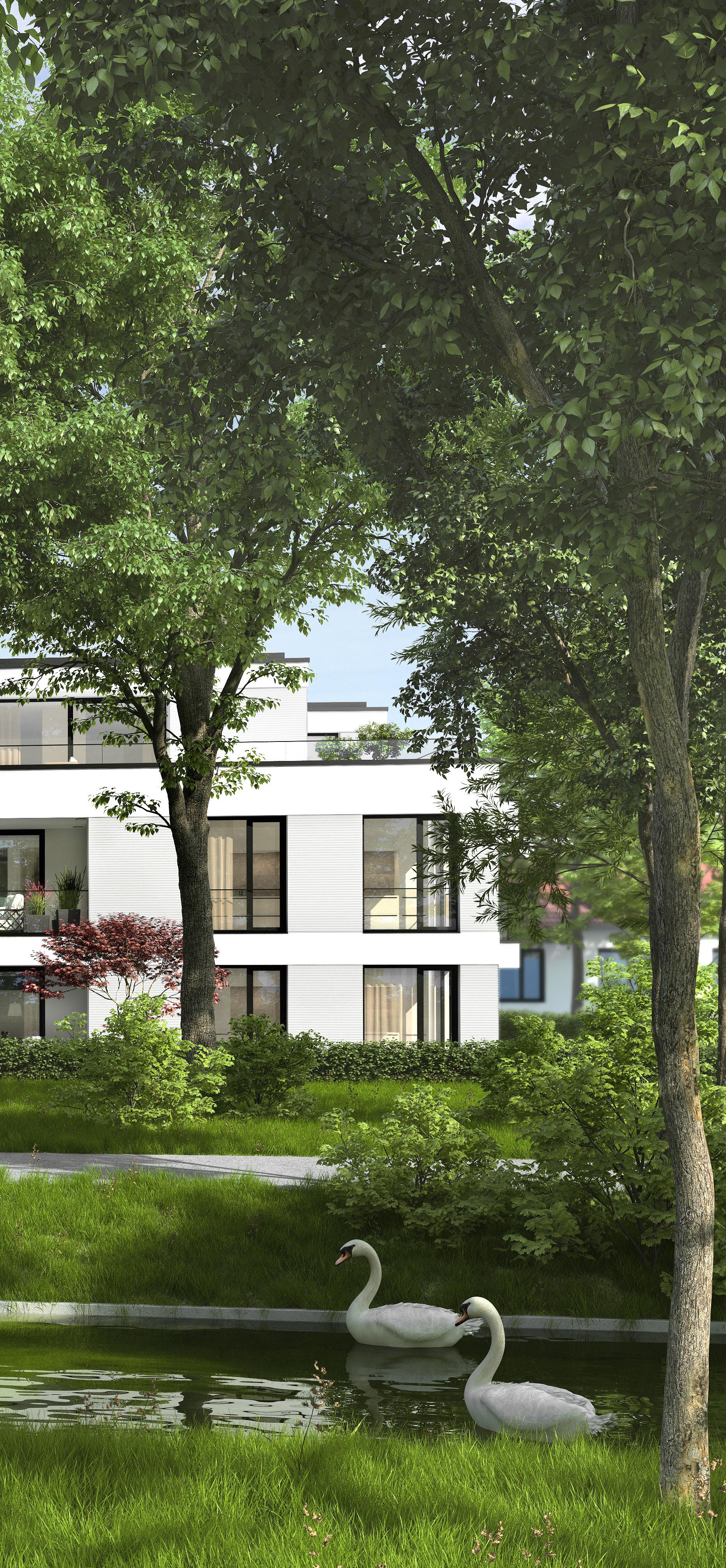 ZWEI SOLITÄREN BAUKÖRPERN MIT JEWEILS VIER HOCHWERTIGEN VILLENWOHNUNGEN UND ZWEI PENTHÄUSERN, DIE DEN BLICK AUF DAS PARKÄHNLICHE GRUNDSTÜCK UND DIE AUSSERGEWÖHNLICHE UMGEBUNG FREIGEBEN.