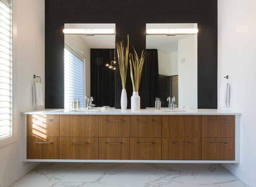 “The two pendants on either side of the vanity provide even light distribution and balance the look of the vanity,” says Mical Secter, showroom manager for Total Lighting Sales.