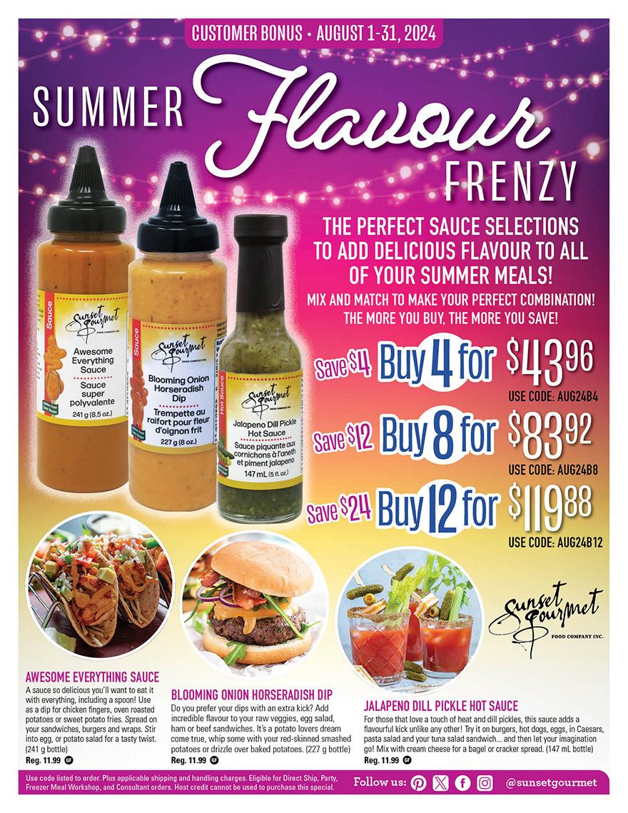 I am excited to welcome you on a tour of our 2024 Spring & Summer catalogue that is filled with delicious products to make mealtimes easier and tastier than ever before. If you have never had the opportunity to experience the delicious flavours of Sunset Gourmet, you are in for a real treat. Twice a year we introduce new products to add to our customer’s favourites.