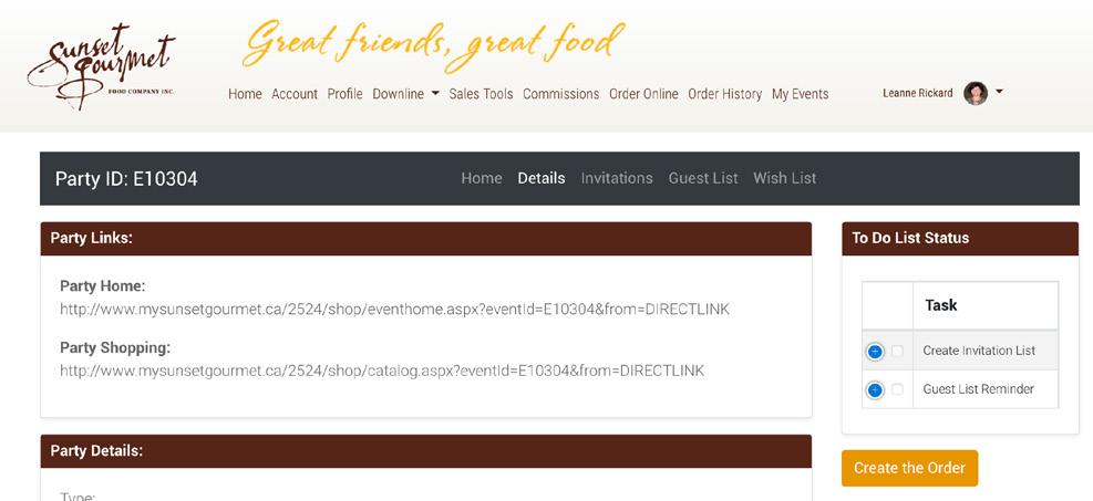 When the party date has been chosen, one of the first things you should do is set up your party in the “My Events” section in your “back office” at www.mysunsetgourmet.ca