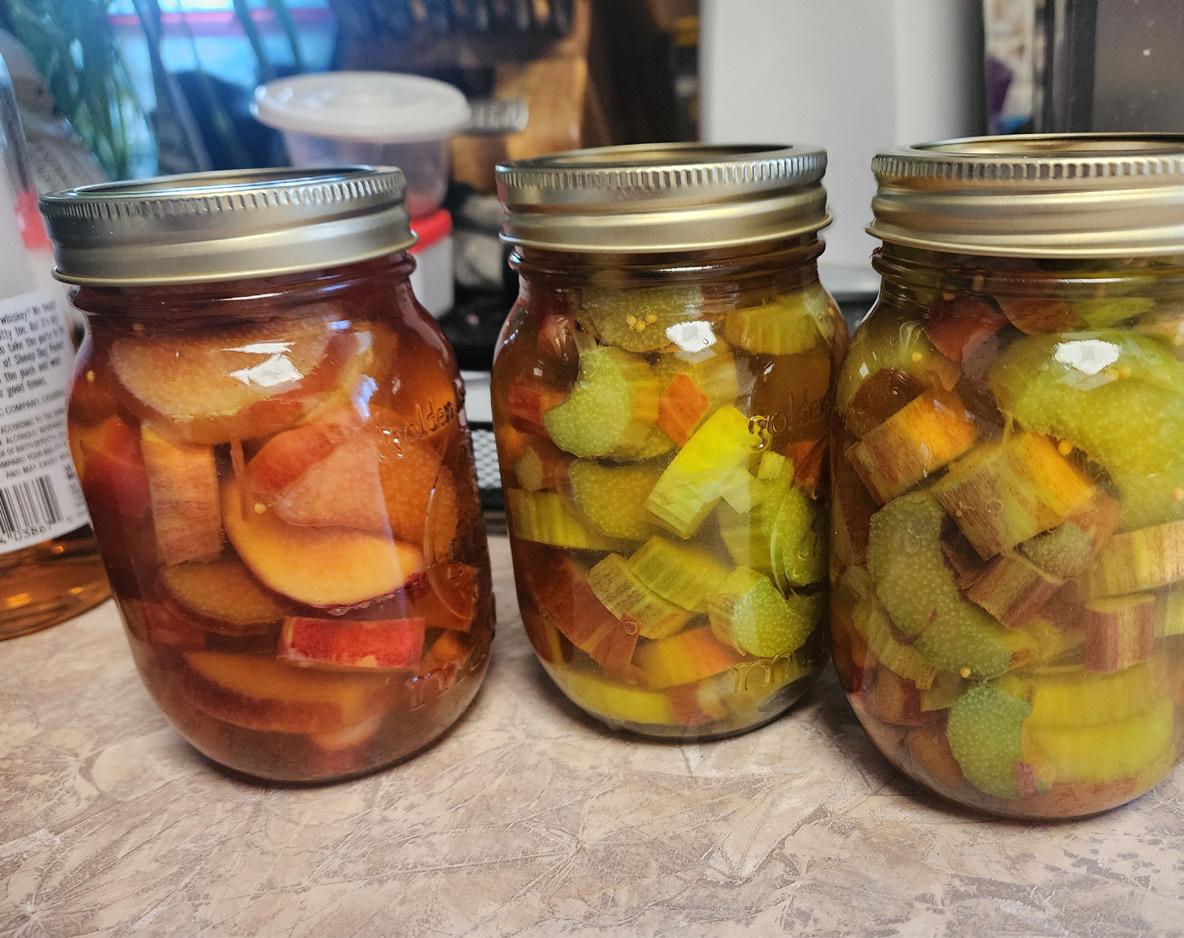 Pick, wash and slice several stalks of rhubarb; put them into jars. Pour hot brine over and let cool. Seal, refrigerate, and enjoy! Tastes great on a burger! You can shred the pickles, add a small shake of cinnamon and they are an amazing condiment with pork roast.