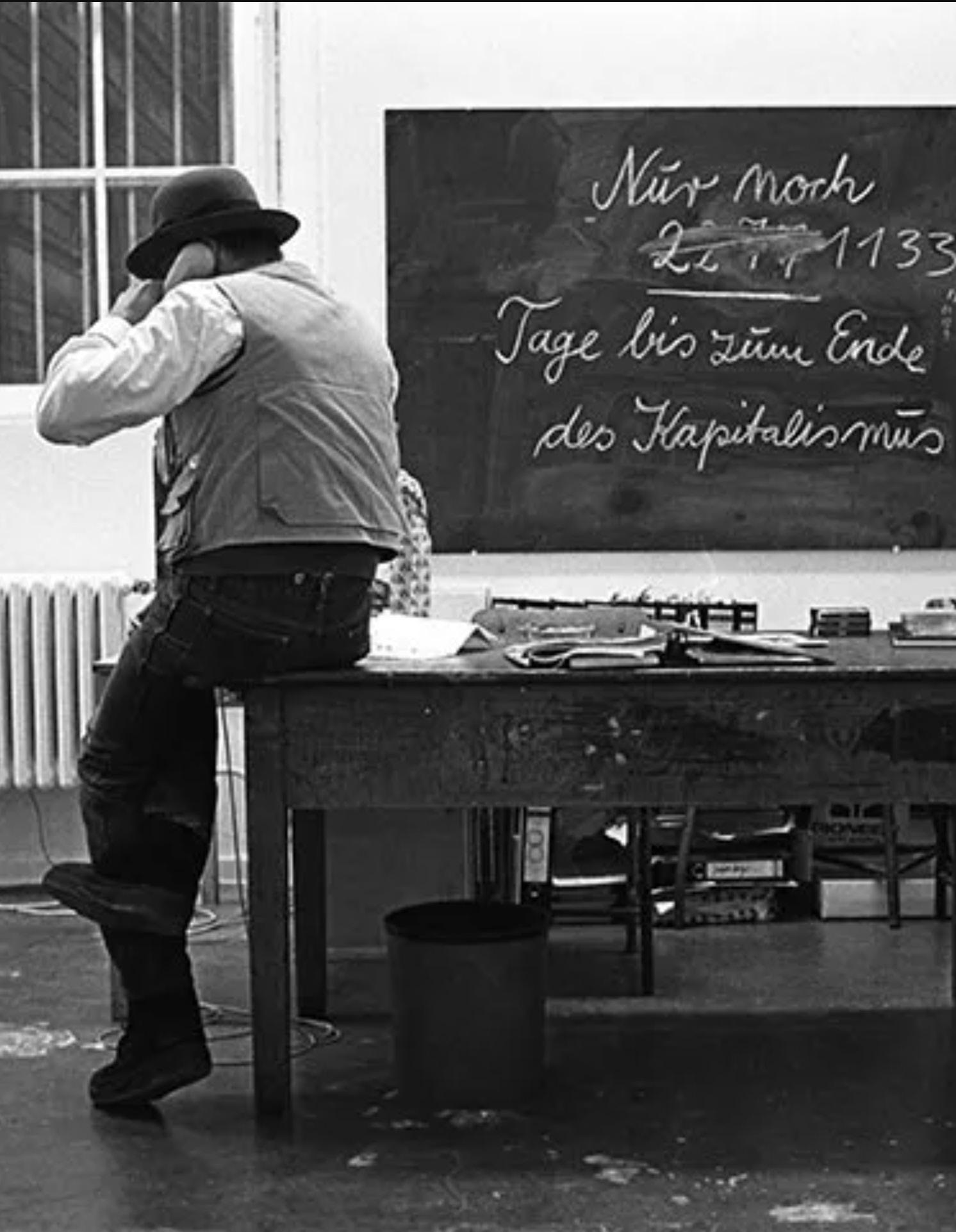 Beuys co-founded the German Green Party, which integrated politics with environmentalism, and the Free International University, which rejected traditional educational frameworks that conflicted with the artist’s democratic ideals for learning and teaching spaces. As a professor at the Kunstakademie Düsseldorf in the 1960s and early 1970s, Beuys grew increasingly frustrated by the institution’s restrictions on his teaching methods. He intentionally overenrolled his classes with students who had been rejected and organized an occupation of the administrative offices. These actions led to his dismissal from the academy, an event that only intensified his political convictions.