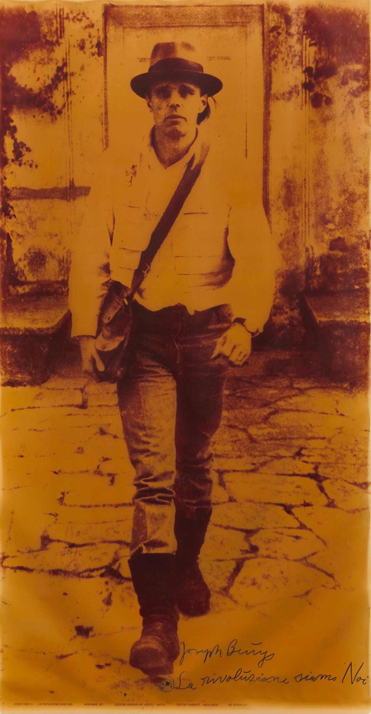 The photograph featured in La Rivoluzione siamo Noi (We Are the Revolution) was originally used as a poster for an exhibition of Beuys’s work at Lucio Amelio Gallery in Naples in 1971. The artist presents himself mid-stride, his posture strong and upright with his gaze directed squarely at the viewer. The translation of the title and the composition of the image embody Beuys’s politically oriented practice, challenging the viewer to press forward in the fight for change.