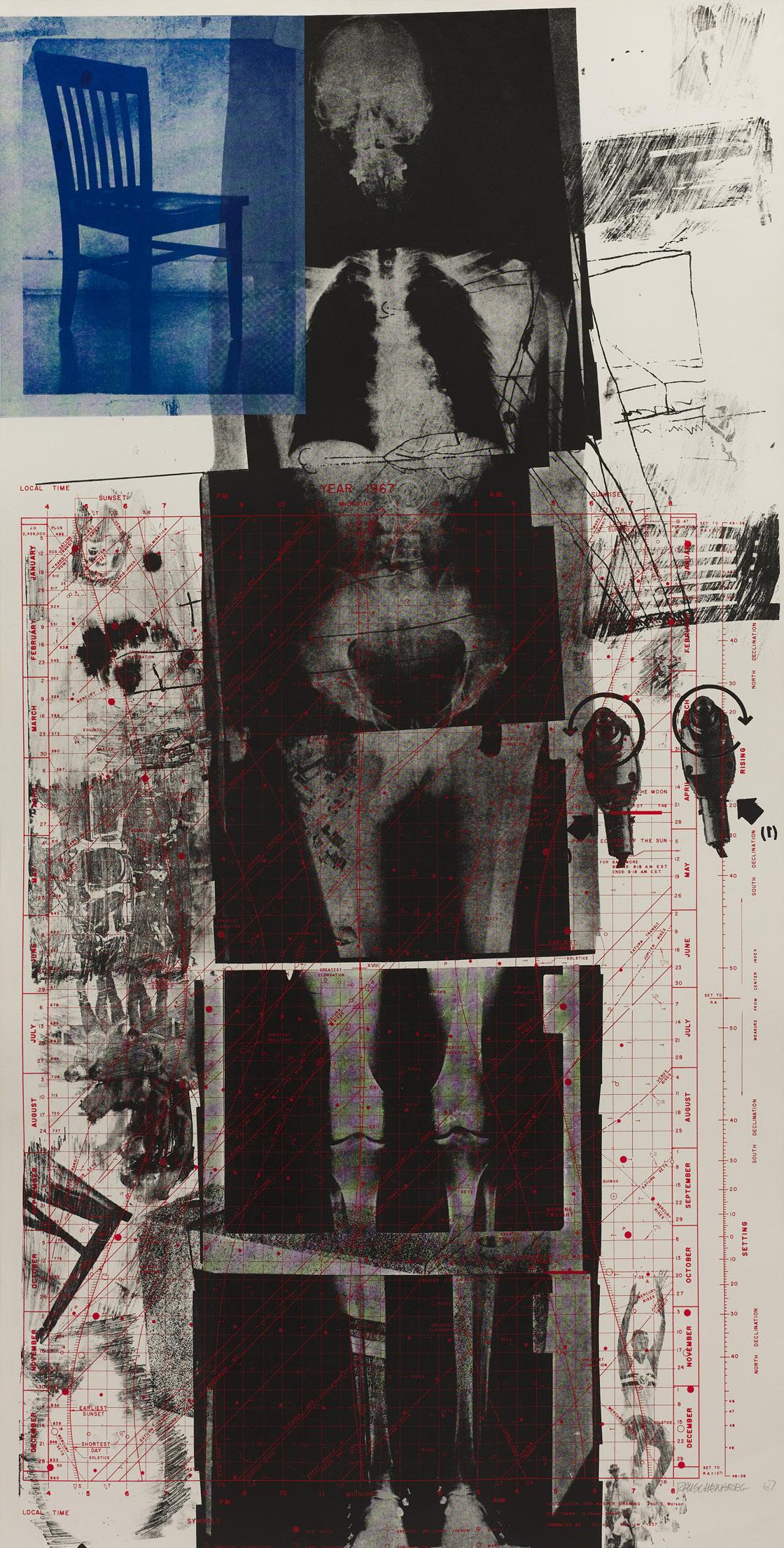 The project began with a complete X-ray of Rauschenberg’s body. Taken in six segments (X-ray machines were then limited to one-foot images), the process literalized his desire to self-examine. Additional elements include an astrological chart for 1967, silkscreened over the lithograph, and imagery of athletes, power drills, car crashes, and a solitary chair, which Rauschenberg transferred through photolithographic plates.