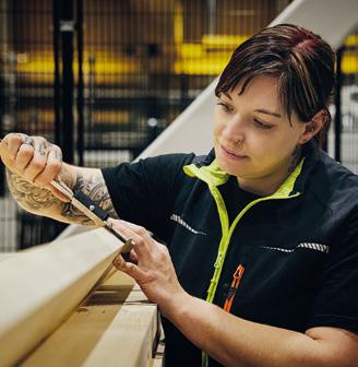 längengemessen und von einer fliegenden Säge entsprechend verkürzt. Danach werden die fertigen Lamellen in der richtigen Länge an den Anlagenteil von Kallesoe übergeben. In den leistungsstarken Hochfrequenzpressen von Kallesoe werden die Bretter dann mit einem 2-KompontensystemKlebstoff zu CLT-Paneelen verleimt. Neben den geringeren Kosten, im Vergleich zu PURKlebstoffen, ist einer der größten Vorteile der Verwendung eines 2-Komponentensystems, dass der Klebstoff erst bei Hitze aushärtet und daher mehr Flexibilität im Produktionsprozess ermöglicht. All dies ermöglicht es LOC hochwertige, ästhetische Holzelemente herzustellen, welche die natürliche Schönheit des Baustoffes Holz unterstreichen.