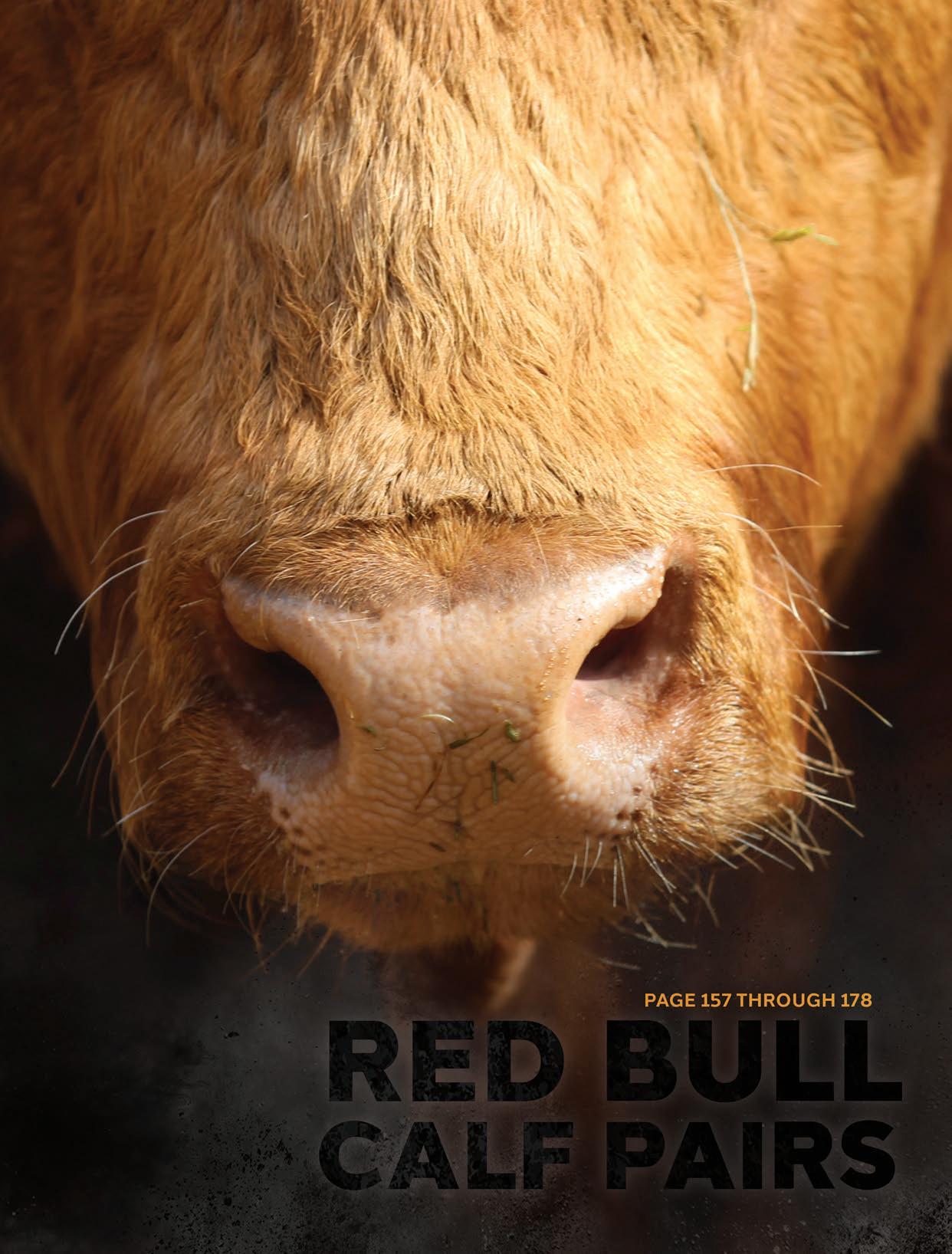 • BW: 90 lbs. • Reddington that has look, hair, and all the ingredients he displays • BW: 90 lbs. • Sharp, red baldy with excellent bone • BW: 90 lbs. • We love how our red cattle have developed, females like this are what create a herd NCB COBRA 47Y R PLUS VENOM 4006B IPU MS. TULA 104Z R PLUS REDDINGTON 0143H R PLUS REDGE 8018U MISS R PLUS 6168D MISS R PLUS 1033Y PROFIT TCCO BIG SPENDER 659D TCCO BLACK KOKO 2X MISS R PLUS 9257G R PLUS REDGE 8018U MISS R PLUS 69X MISS R PLUS 4133P MISS R PLUS 2312K 611 LRPS 2312K CA-PG1396988 26/2/2022 R PUREBRED P CE BW WW YWMILK MCE MWWT STAY 8 3.9 76.4 108.822.9 3.9 61.1 14.6 CW REA FAT MARBAPI TI 18 0.76 -0.109 -0.13103.47 67.16 NCB COBRA 47Y R PLUS VENOM 4006B IPU MS. TULA 104Z R PLUS REDDINGTON 0143H R PLUS REDGE 8018U MISS R PLUS 6168D MISS R PLUS 1033Y LFE MR LEWIS 514N LFE RS LEWIS 327S LFE CALYNA 615M MISS R PLUS 1196Y SIMMENTAL/SIMMENTAL MISS R PLUS 2314K 612 LRPS 2314K CA-PRS1396990 26/2/2022 R PERCENTAGE P CE BW WW YWMILK MCE MWWT STAY 10.2 2 73.1 10322.4 5 59 12.9 CW REA FAT MARBAPI TI 17.8 0.63 -0.105 -0.14104.35 67.38 NCB COBRA 47Y R PLUS VENOM 4006B IPU MS. TULA 104Z R PLUS REDDINGTON 0143H R PLUS REDGE 8018U MISS R PLUS 6168D MISS R PLUS 1033Y TWIN-CHIEF PRINCE 203P R PLUS BLACKOUT MISS R PLUS 5083R MISS R PLUS 102X R PLUS BLACKEDGE MISS R PLUS 7085T BUTE MS PATTY 2P MISS R PLUS 2333K 613 LRPS 2333K CA-BPG1406348 1/3/2022 B PUREBRED P CE BW WW YWMILK MCE MWWT STAY 8.6 3.7 77.3 113.324.3 2.6 63 16.8 CW REA FAT MARBAPI TI 28.9 0.81 -0.101 -0.11111.06 68.77 373