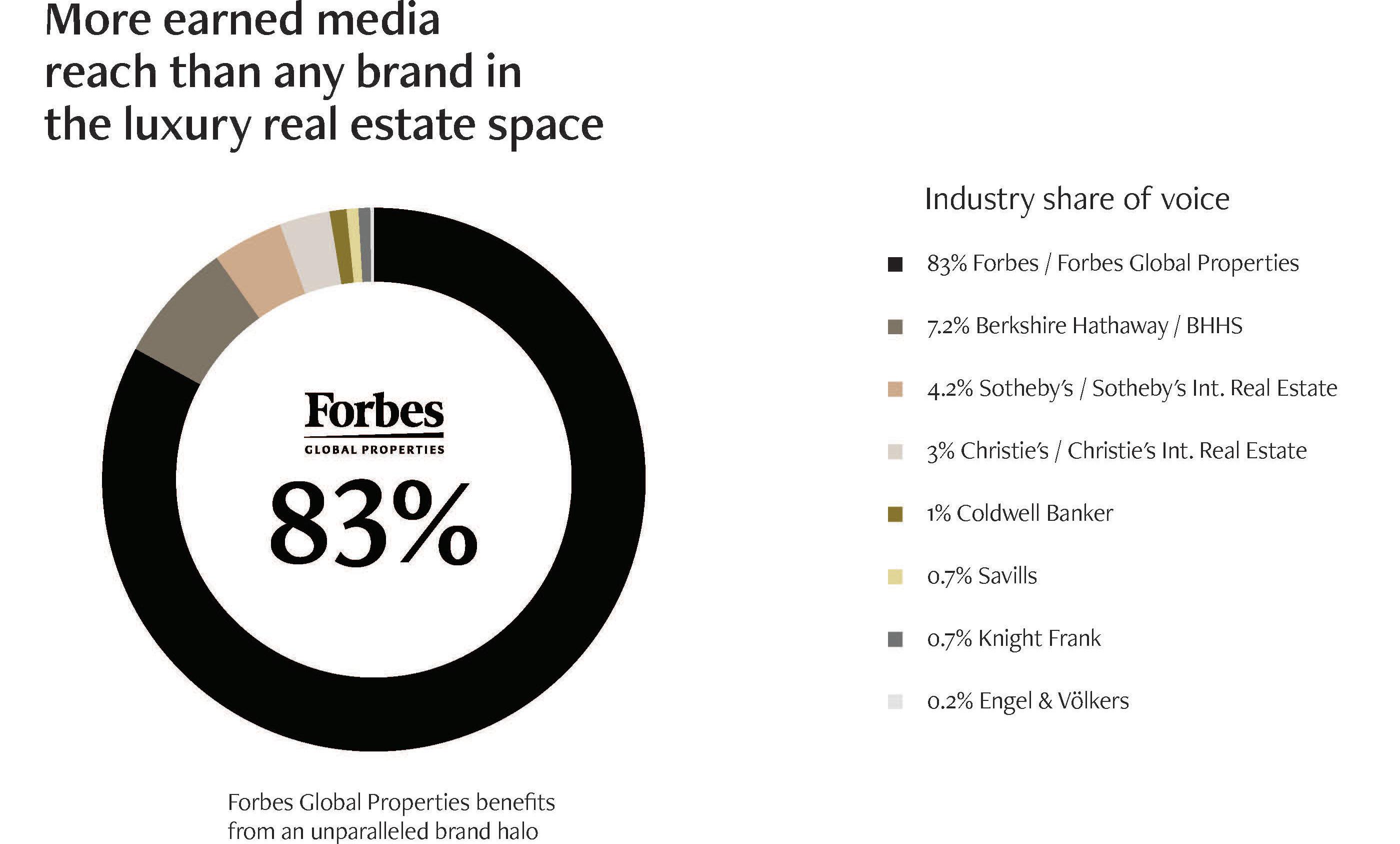 These charts demonstrate the unparalleled reach and penetration of the Forbes brand. This analysis illustrates that Forbes and Forbes Global Properties combined have the greatest share of voice of any brand in the luxury real estate industry globally. To help you explain this powerful metric, we’ve created suggested captions you can use in social media posts and in talking points in listing presentations.