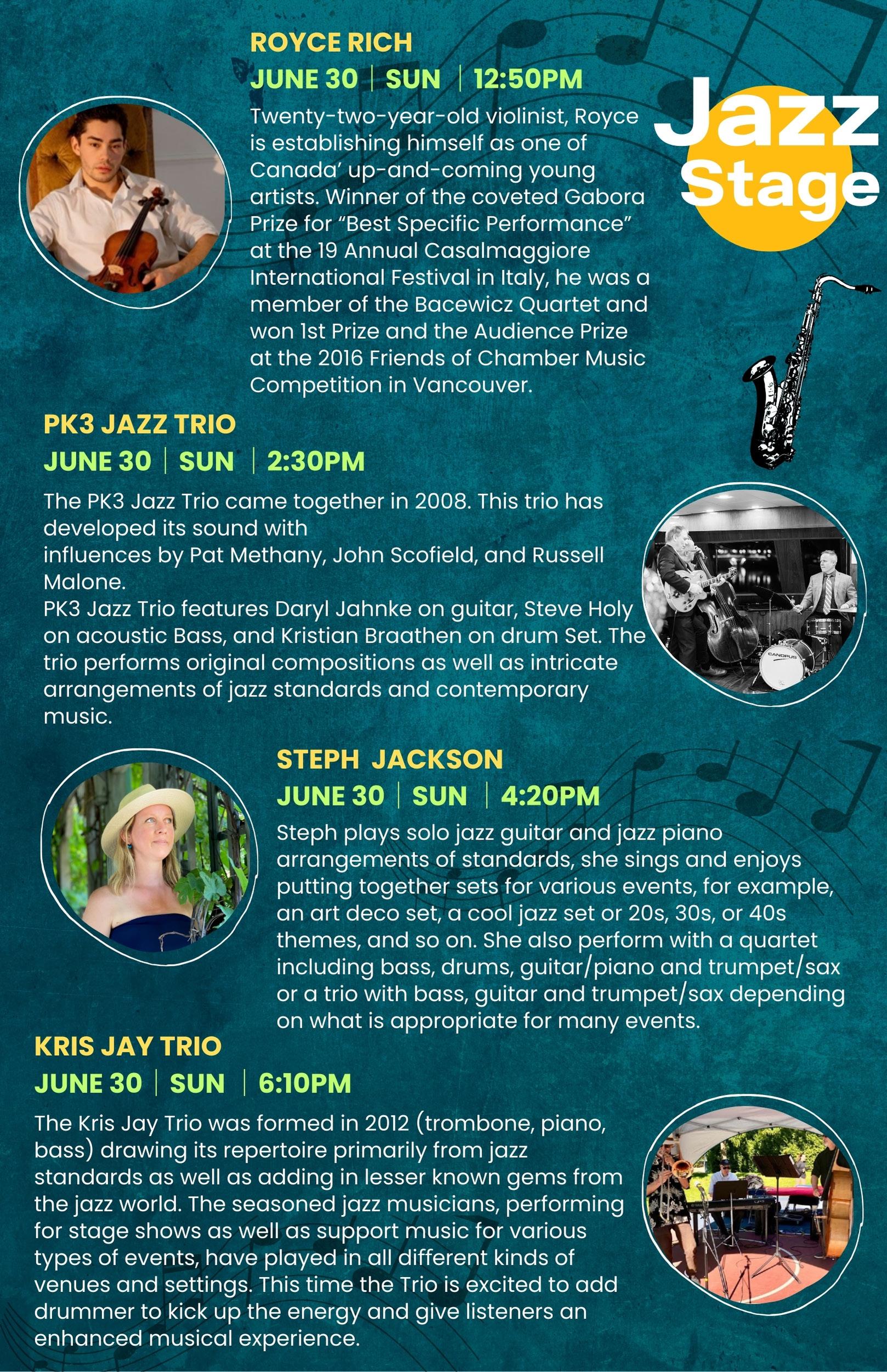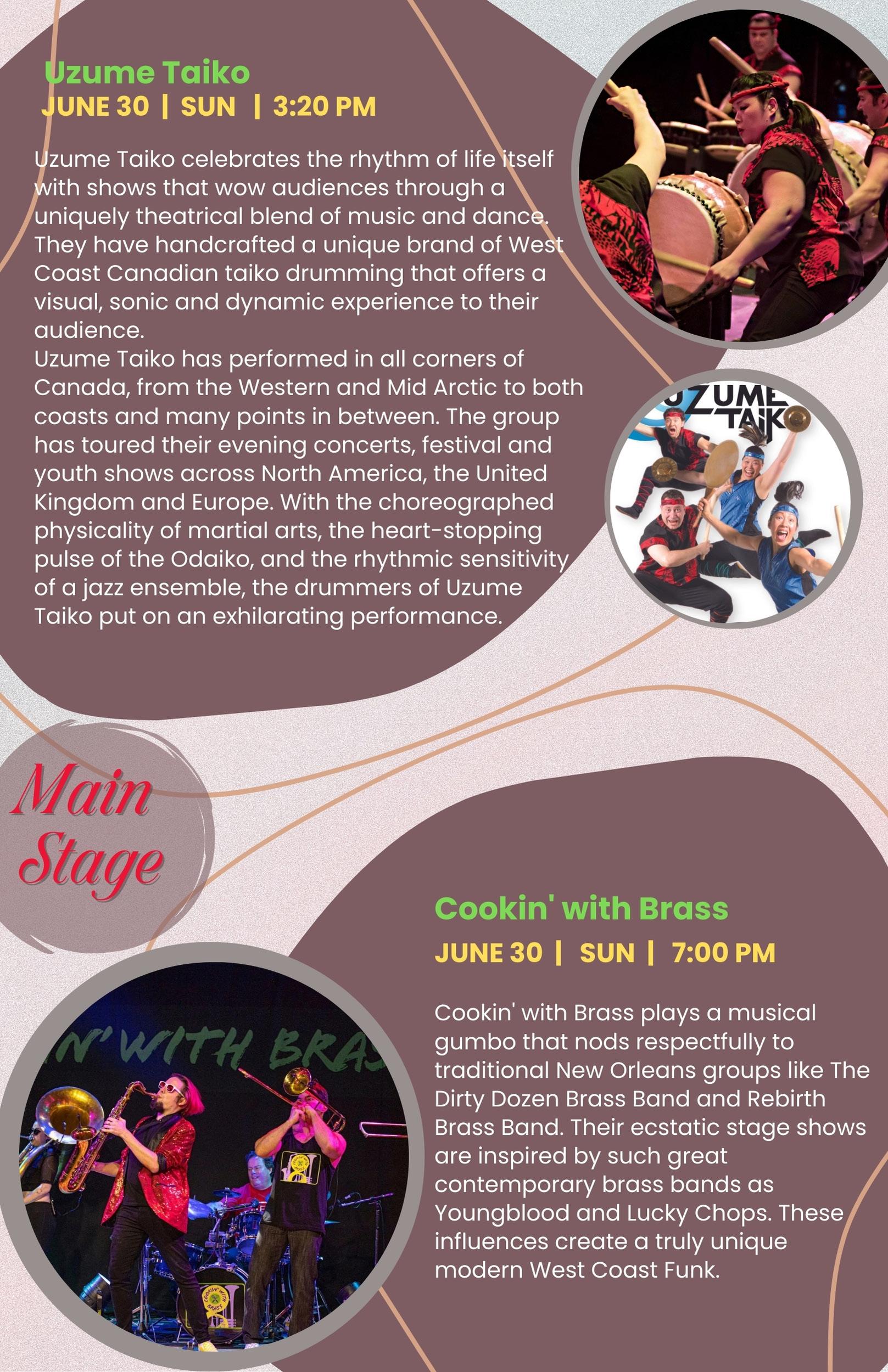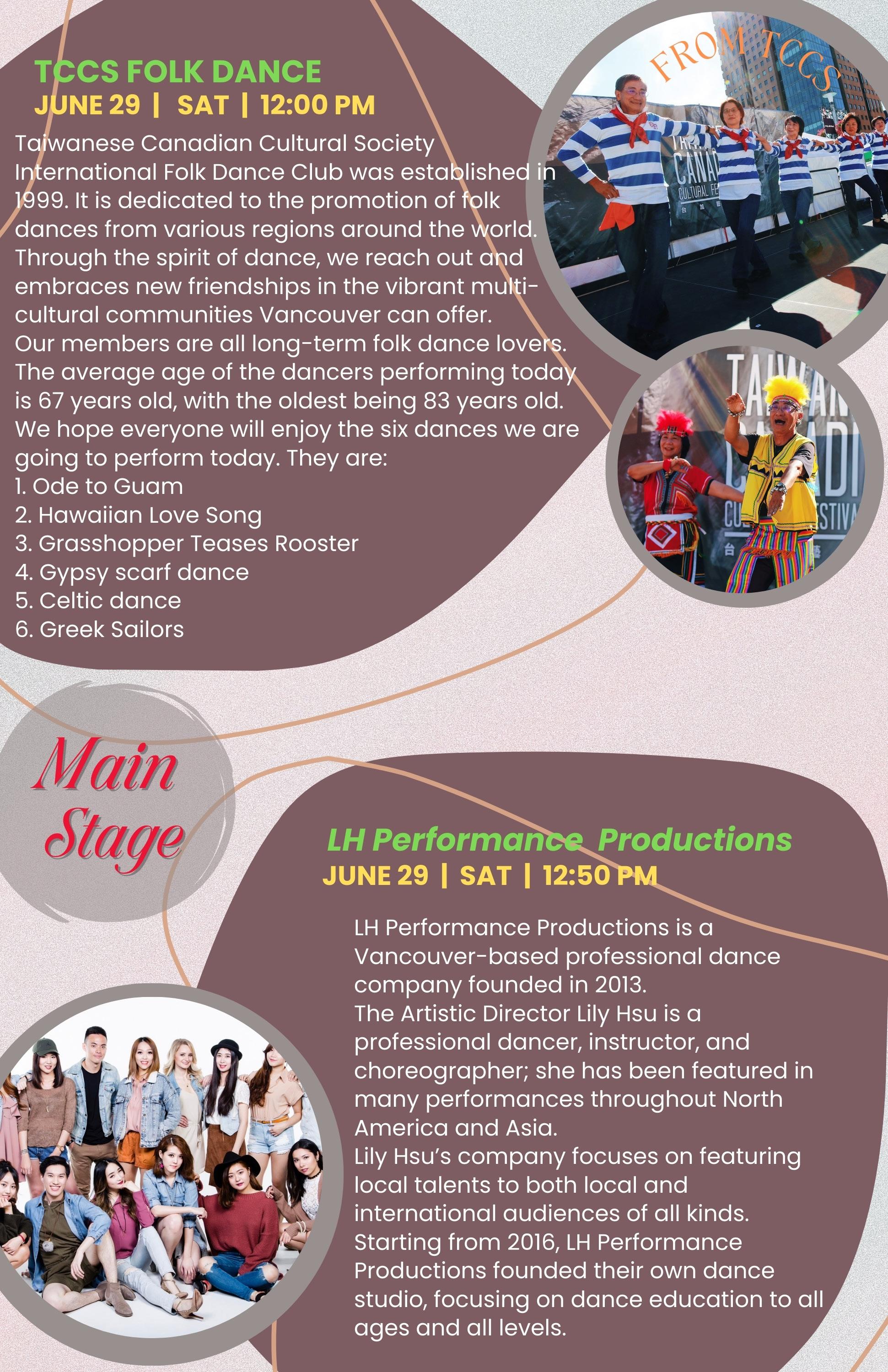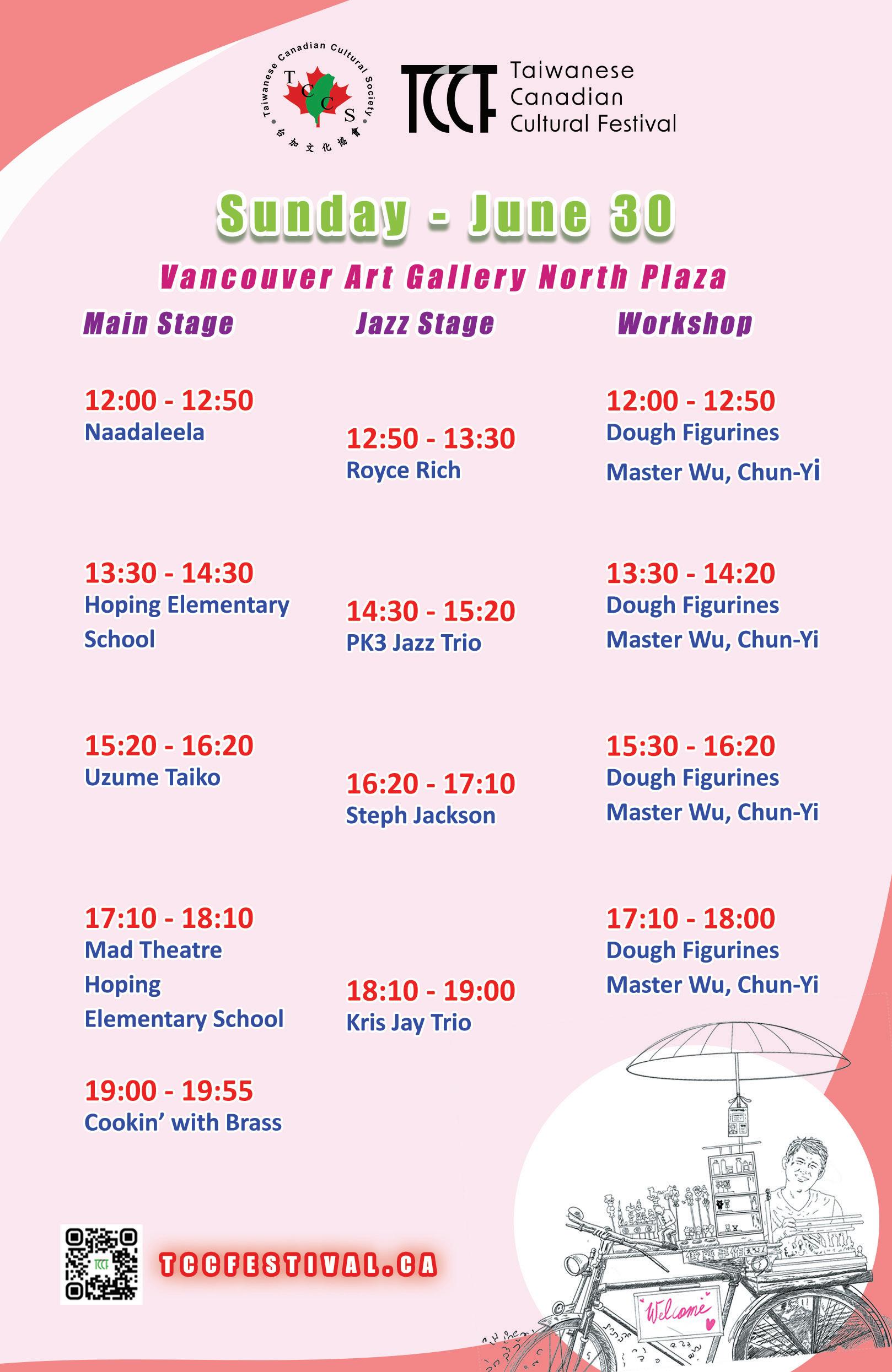 The 2024 TCCF presents Canadian and Taiwanese artists from different disciplines. The week-long festivities include multi-day outdoor activities, an indoor concert, and a virtual cinema. All outdoor activities, offering two performing stages, arts and crafts workshops, artist exhibitions, and a TCCS Taiwan school, are accessible at Vancouver Art Gallery North Plaza between June 29 and July 1. Besides 18 Canadian performing groups, the festival highlights Mad Theatre and Taichung Hoping Elementary School Dance Troupe, Taipei First Girls High School Marching Band, and a Taiwanese dough figurines master, Wu Chun-Yi from Taiwan.