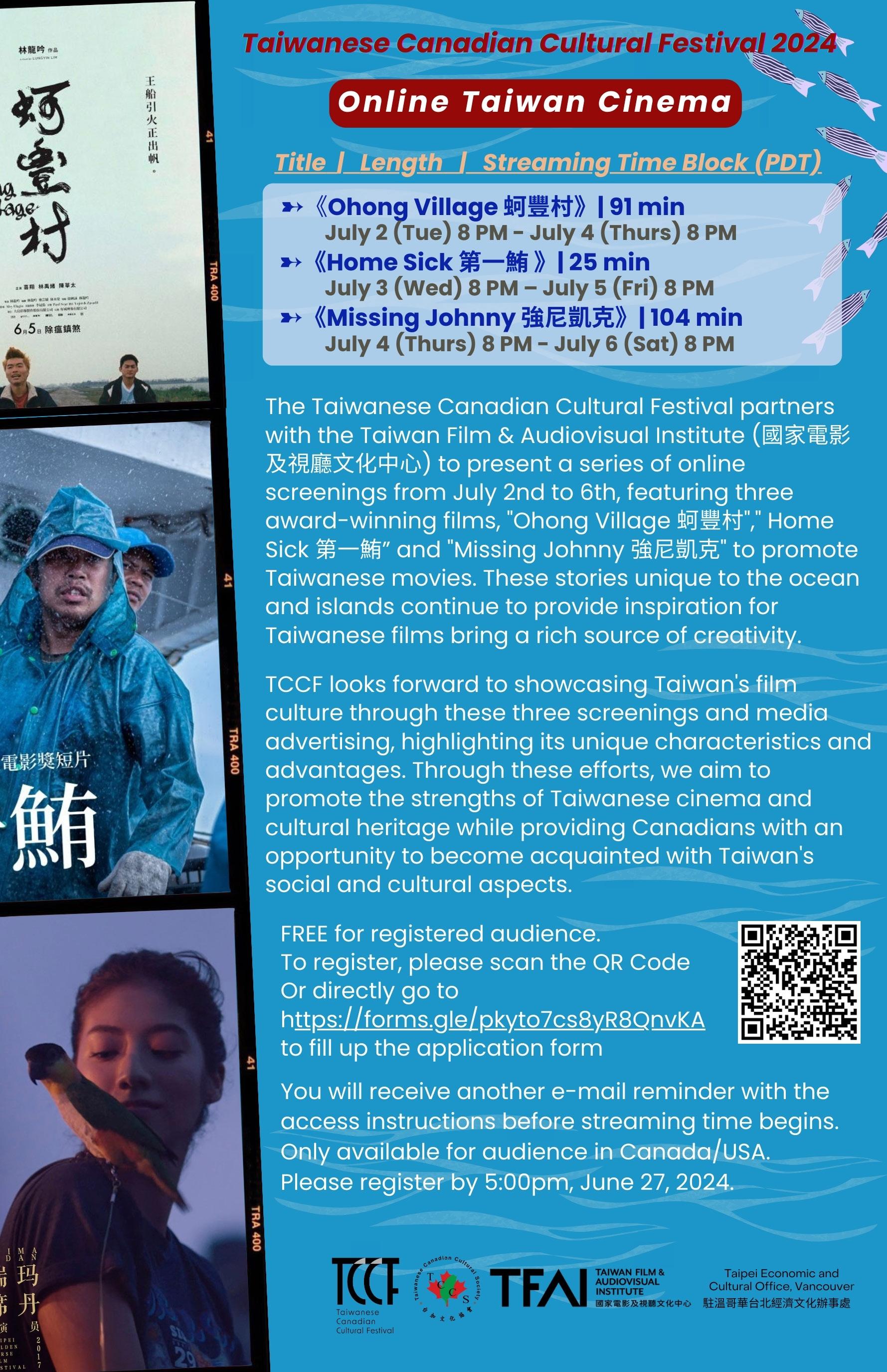 Taiwan Virtual Cinema will showcase Taiwanese short films between July 2 and 5. The “Taiwanese & Canadian Musician Series” concert will occur at Vancouver Playhouse Theatre on July 6, featuring Vancouver Formosan Singers.