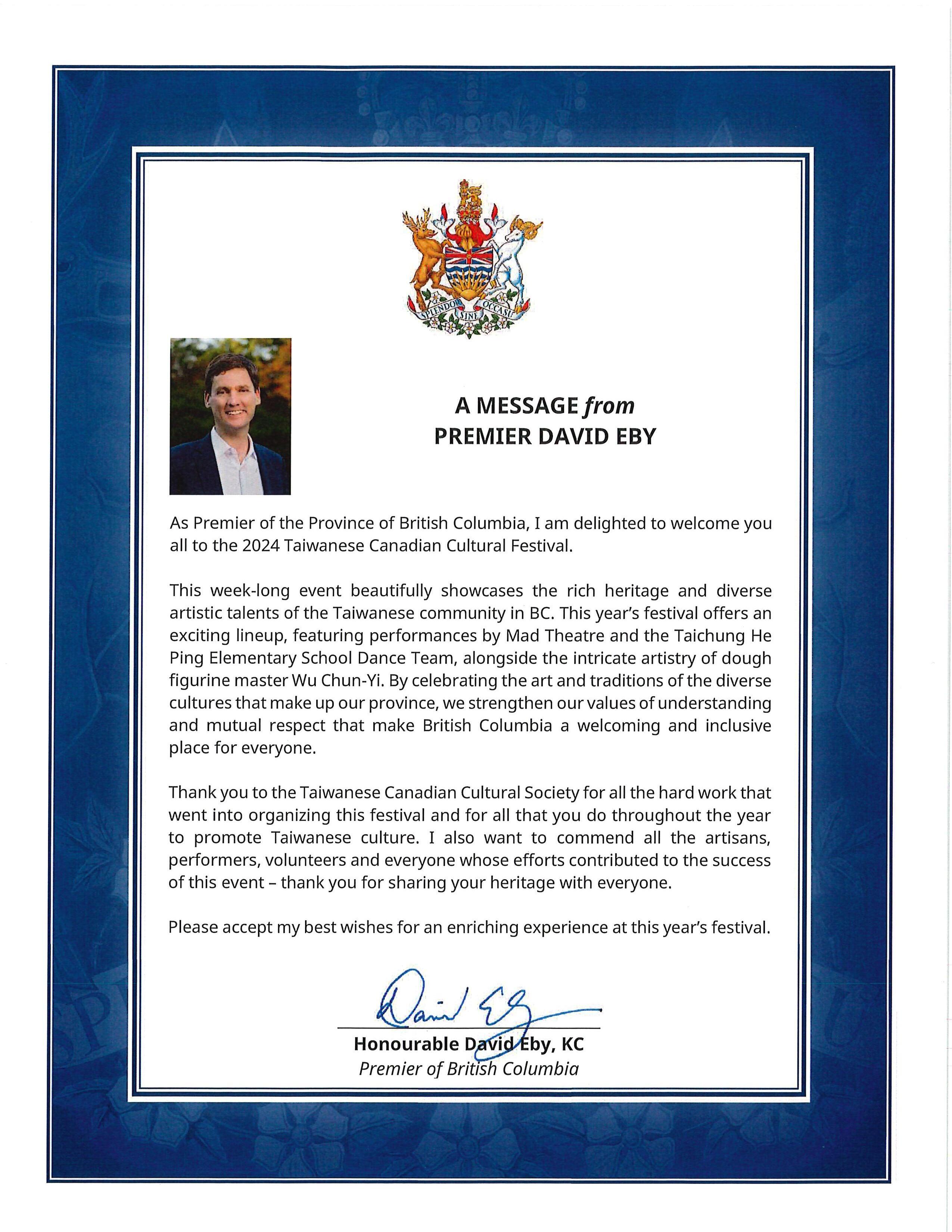 I wish you all a successful and memorable festival experience. May the Taiwanese Canadian Cultural Festival continue to serve as a beacon of cultural celebration and enrichment for years to come.