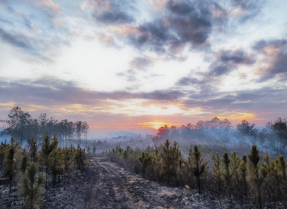 Clockwise from Left: Pinus Palustris and a Prescribed Fire at Sunset by Mark Tuggle; Out on a Limb by Nancy Gale Whitfield; Honorable Mention Art, Lake Fall Scene by Debbie Evers; Honorable Mention Photo Thirsty by Adrienne Gaines; Rocks and Water by Lawrence Grinter.
