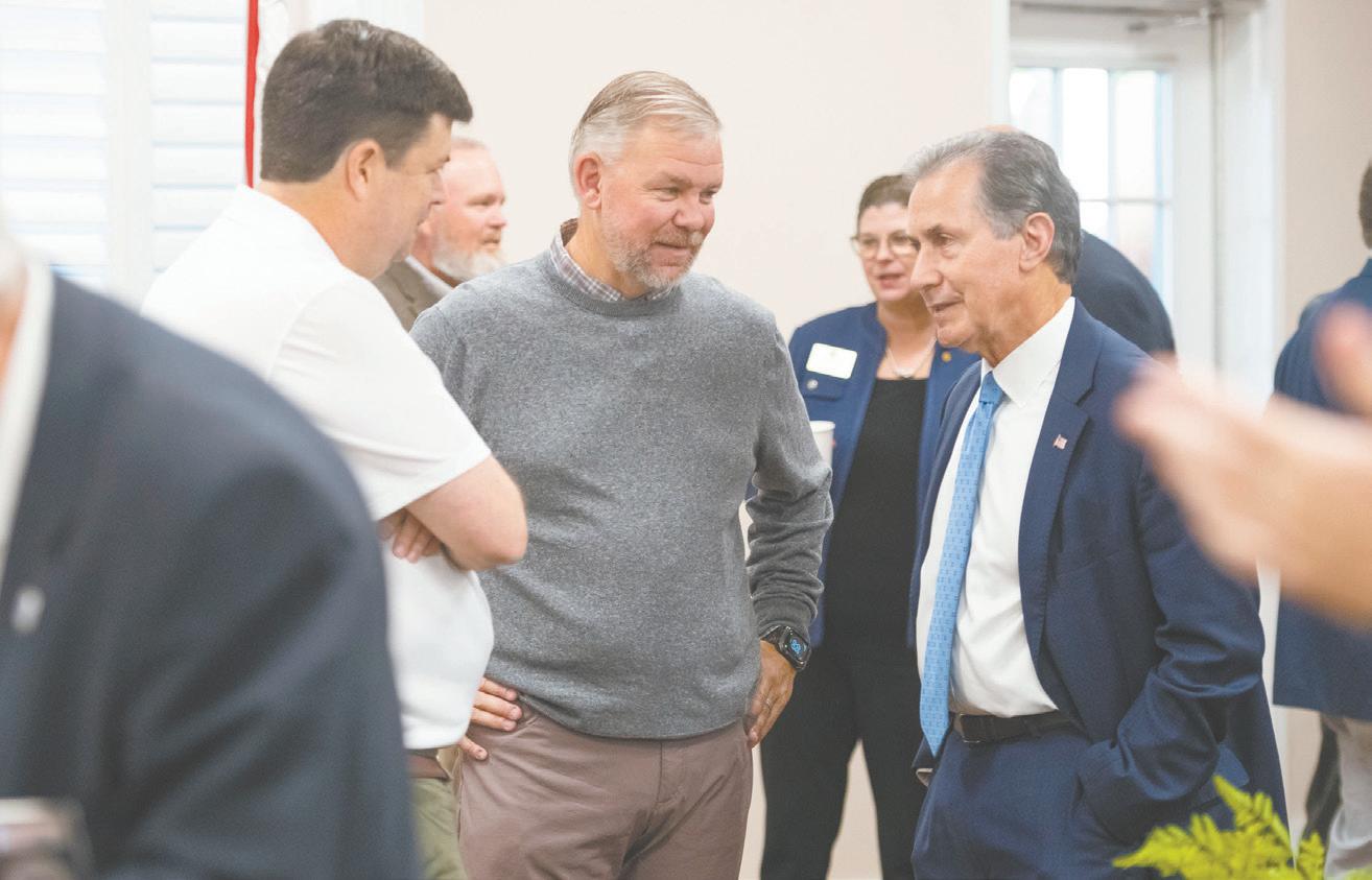 Millbrook City Council president Michael Gay, left, and Elmore County chief operations officer Richie Beyer, center, speak with U.S. Rep. Gary Palmer before a breakfast hosted by the Millbrook Area Chamber of Commerce Friday.
