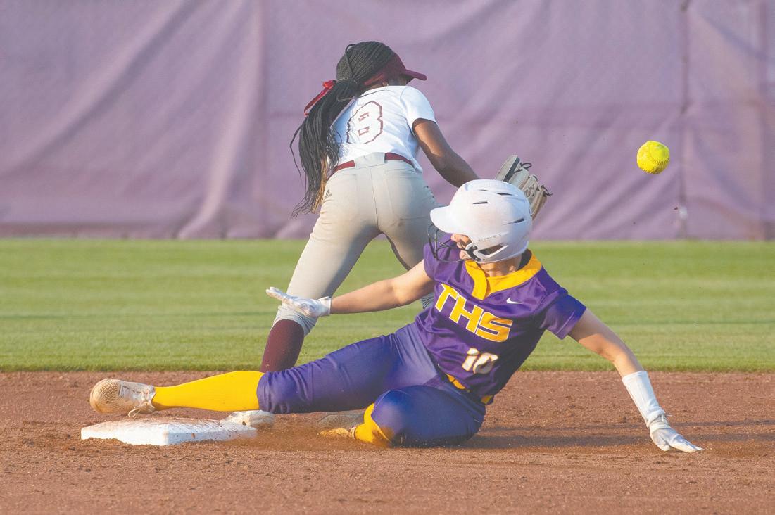 Tallassee’s Alli Smith (10) slides safely into second with a double against Benjamin Russell.
