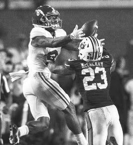 ABOVE: Elmore County’s Tate McNeely (23) tries to move upfield against Holtville’s Stephen Scott (14).