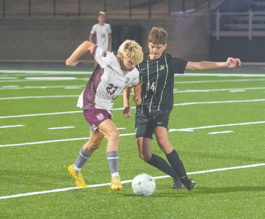 BELOW: Elmore County’s Asher Justice (7) controls the ball as Holtville’s Nathan Phelps (5) defends.