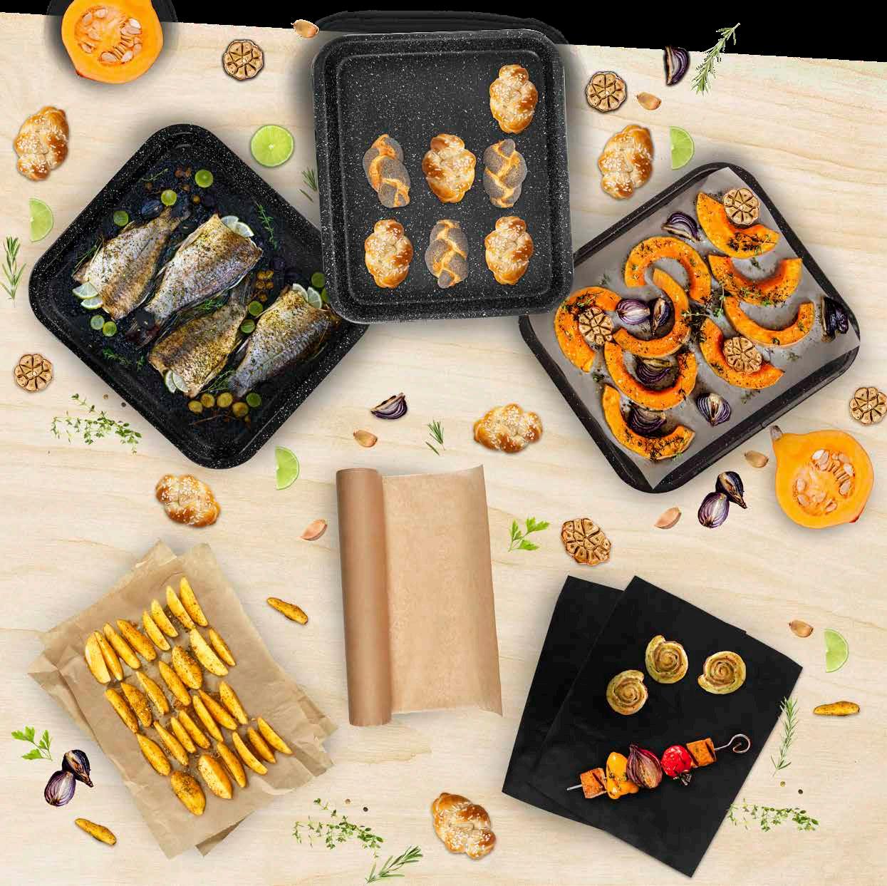 plech 42x37x3,5 cm 123747 smaltovaný plech 42x37x2,5 cm 123746 pečicí papír 38 cmx8 m 750359 pečicí papír 32x45 cm, 20 ks 750361 pečicí fólie 40x33 cm 750343 podložka na pečení/grilování 40x33 cm, 2 ks 111177