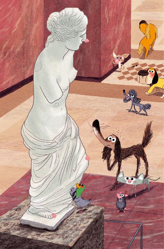 Povero Cane Puzzone, lui di arte non se ne intende, però sa riconoscere un’attività spassosa. Davanti alle statue greche, gli allievi della Real Accademia Canina giocano a scivolare sul pavimento di marmo e fanno a gara di agilità.