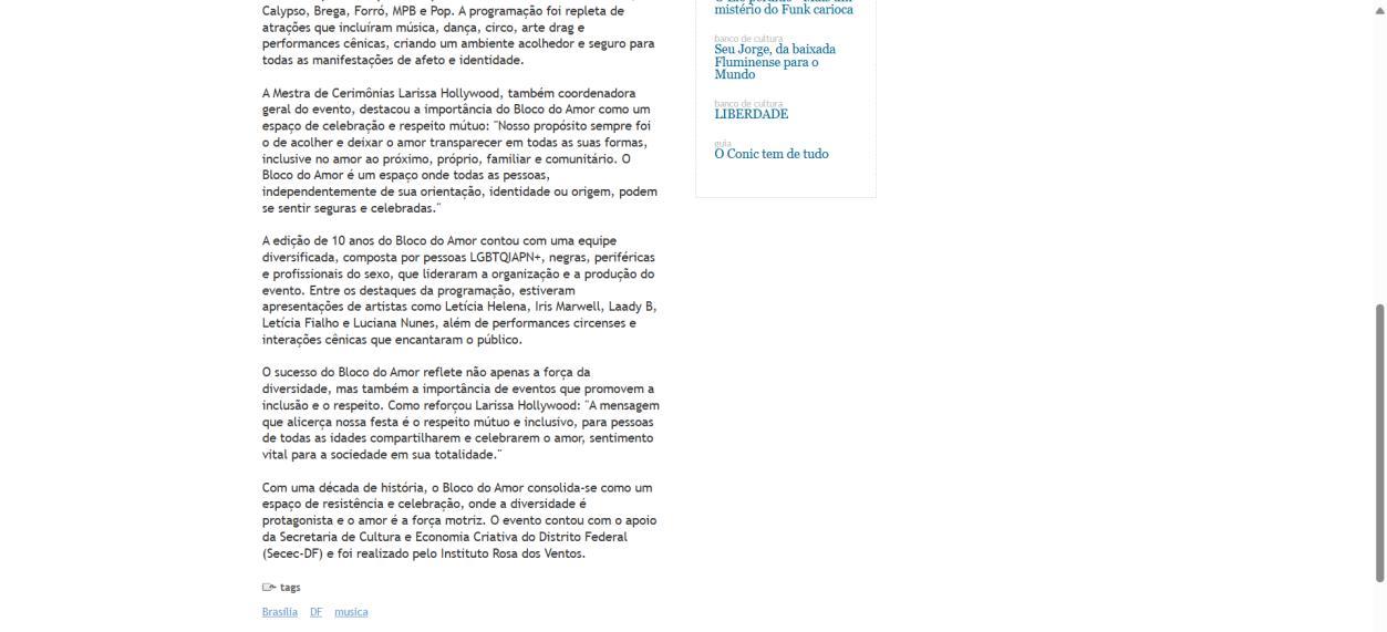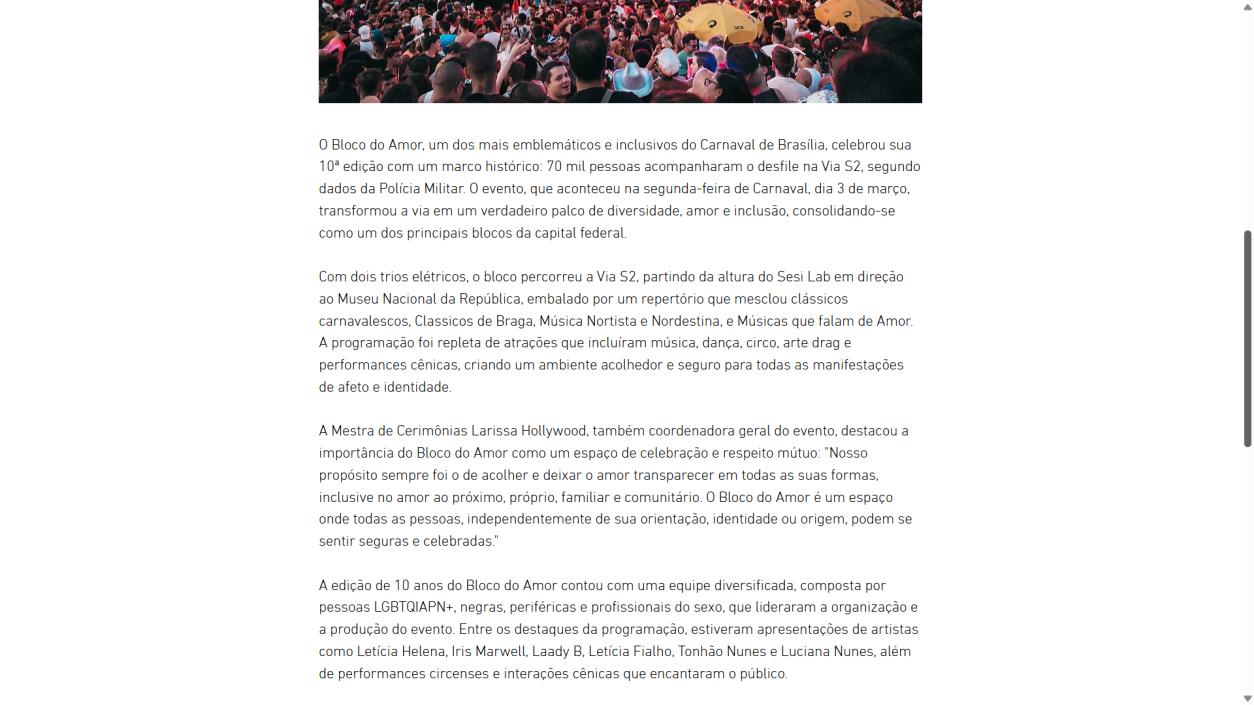 Informações: https://www.instagram.com/blocodoamor/ O Bloco do Amor conta com recursos e apoio da Secretaria de Cultura e Economia Criativa (Secec-DF). O Carnaval do DF 2025 é realizado pela organização da sociedade civil (OSC) Instituto Rosa dos Ventos.