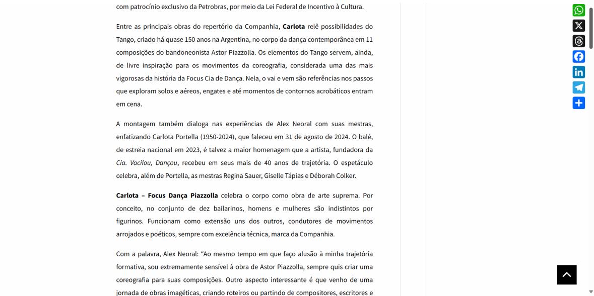 Carlota – Focus Dança Piazzolla fez apresentação de algumas cenas no Festival Quartiers Danses, em Montreal, no Canadá, em 2022, arrebatando a plateia. “Carlota se apropria da melancolia e da rigidez do Tango em cada momento da coreografia. Fala muito de abandono, seja pela atmosfera do gênero, seja por momentos que vivenciei ao longo da minha vida profissional, que fazem parte também da vida de todos nós”, reflete Neoral.