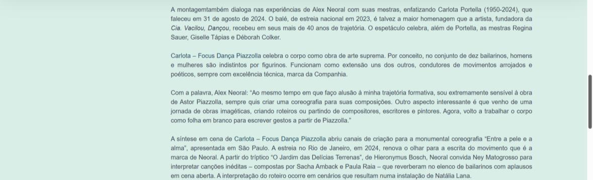 A montagem também dialoga nas experiências de Alex Neoral com suas mestras, enfatizando Carlota Portella (1950-2024), que faleceu em 31 de agosto de 2024. O balé, de estreia nacional em 2023, é talvez a maior homenagem que a artista, fundadora da Cia. Vacilou, Dançou, recebeu em seus mais de 40 anos de trajetória. O espetáculo celebra, além de Portella, as mestras Regina Sauer, Giselle Tápias e Déborah Colker.
