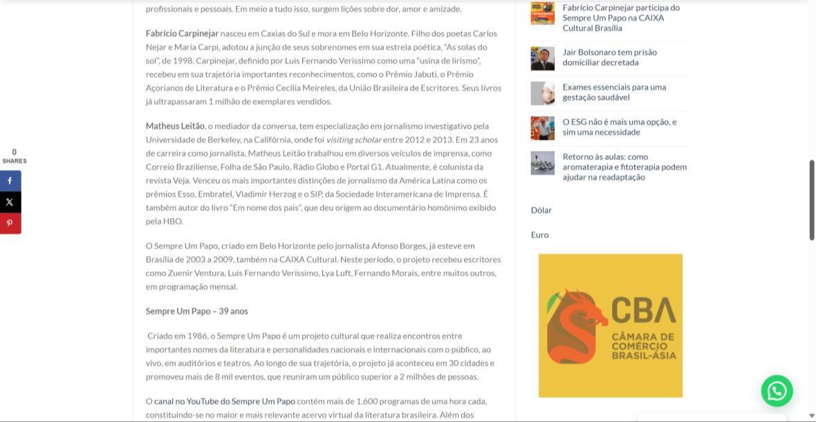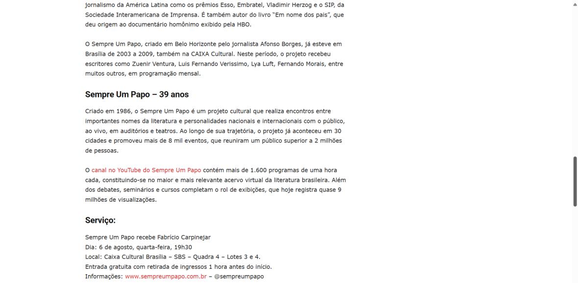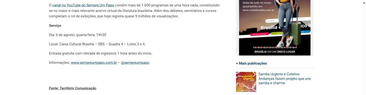 O Sempre Um Papo, criado em Belo Horizonte pelo jornalista Afonso Borges, já esteve em Brasília de 2003 a 2009, também na CAIXA Cultural. Neste período, o projeto recebeu escritores como Zuenir Ventura, Luis Fernando Verissimo, Lya Luft, Fernando Morais, entre muitos outros, em programação mensal.