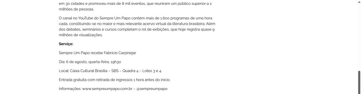 No Sempre Um Papo, Fabrício Carpinejar conversará com o público sobre seu livro “Se eu soubesse: Para maiores de 40 anos” (Editora Bertrand Brasil) e as temáticas que ele aborda, como relacionamentos, família e a passagem do tempo. Carpinejar tem mais de 50 livros publicados, entre eles “Manual do luto”; “Minha esposa tem a senha do meu celular”; “Depois é nunca”; e “Coragem de viver”. Suas obras transitam entre diversos gêneros, como crônica, poema, infantojuvenil e jornalismo literário.