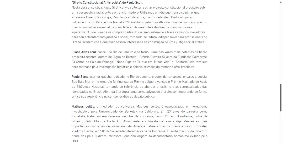 No encontro, a conversa se debruça sobre as urgências do presente a partir da literatura e da crítica social. “Meridiana”, novo livro de Eliana Alves Cruz, entrelaça memória, afetos e ancestralidade para narrar resistências e silenciamentos que moldaram o Brasil. Já “Direito Constitucional Antirracista”, de Paulo Scott, propõe uma reflexão contundente sobre como a prática jurídica pode e deve enfrentar o racismo estrutural, articulando teoria, militância e vivências.