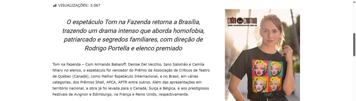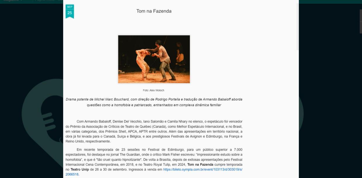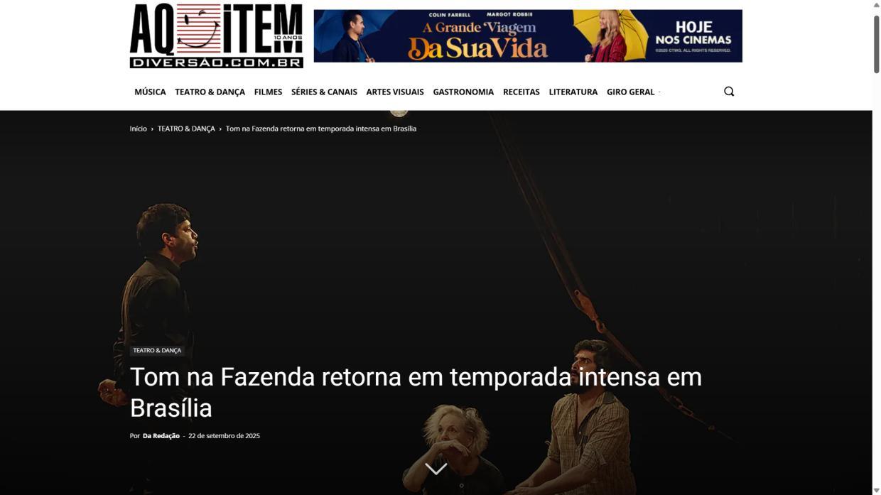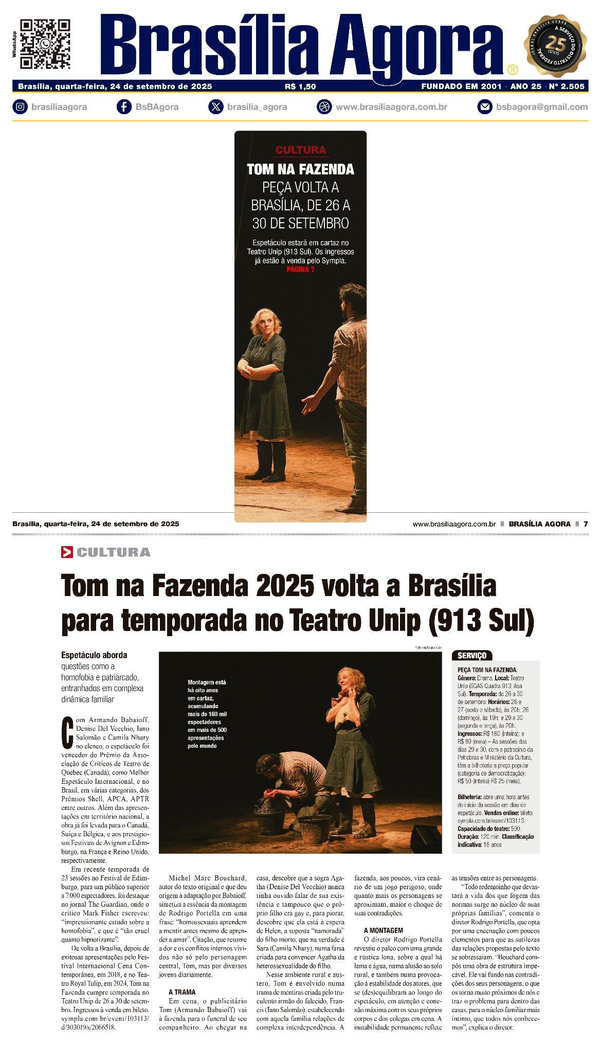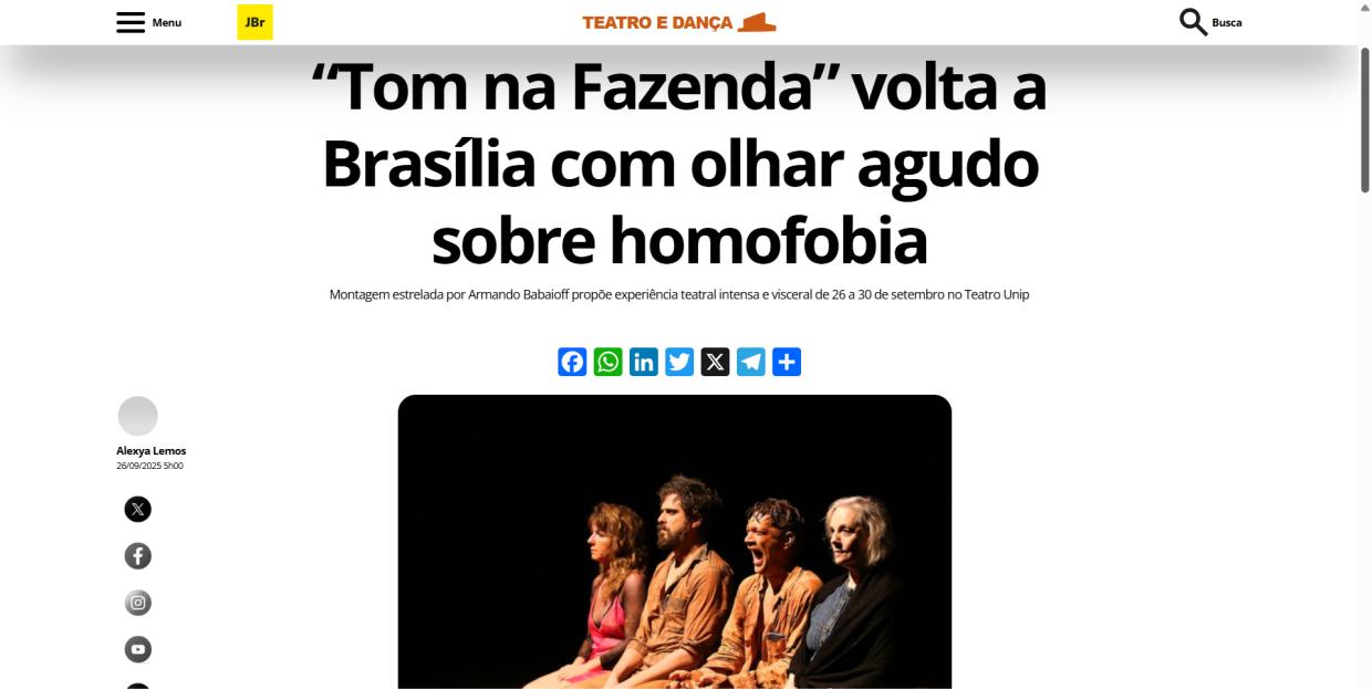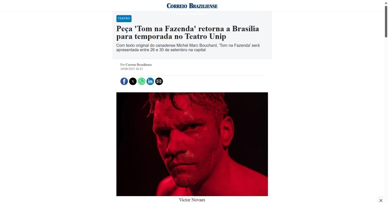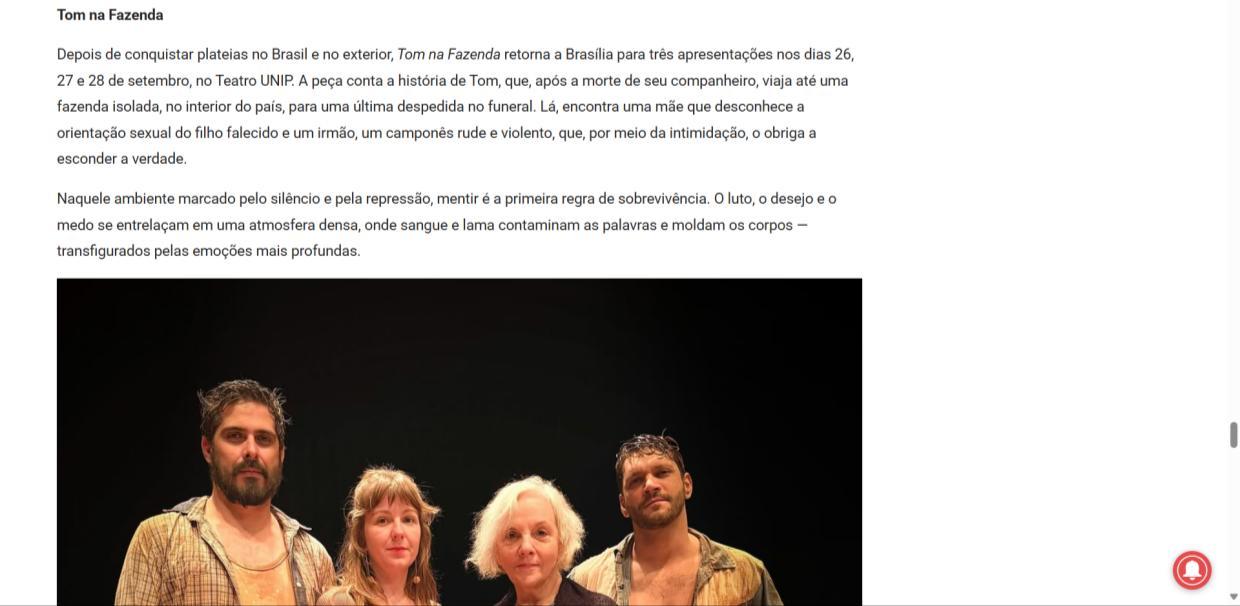Em recente temporada de 23 sessões no Festival de Edimburgo, para um público superior a 7.000 espectadores, foi destaque no jornal The Guardian, onde o crítico Mark Fisher escreveu: “impressionante estudo sobre a homofobia”, e que é "tão cruel quanto hipnotizante". De volta a Brasília, depois de exitosas apresentações pelo Festival Internacional Cena Contemporânea, em 2018, e no Teatro Royal Tulip, em 2024, Tom na Fazenda cumpre temporada no Teatro Unip de 26 a 30 de setembro. Ingressos à venda em https://bileto.sympla.com.br/event/103113/d/303019/s/2066518.