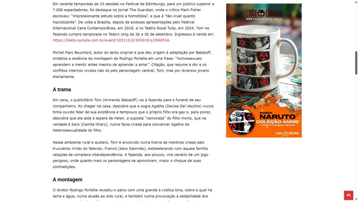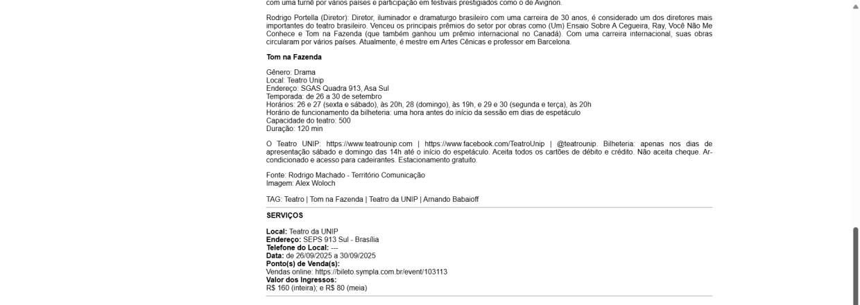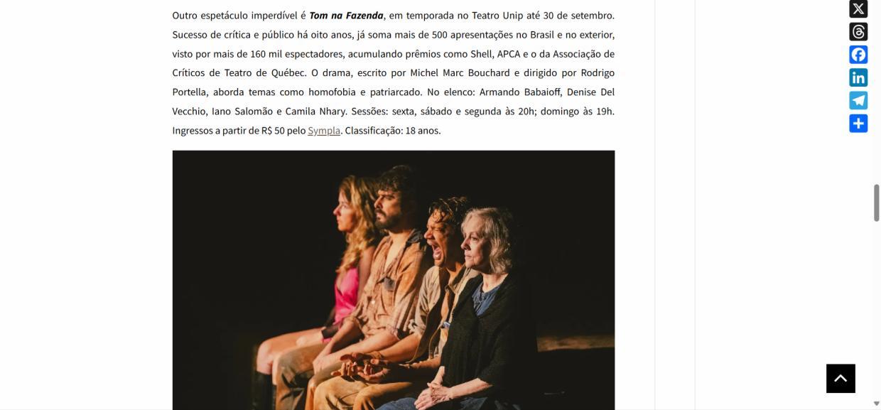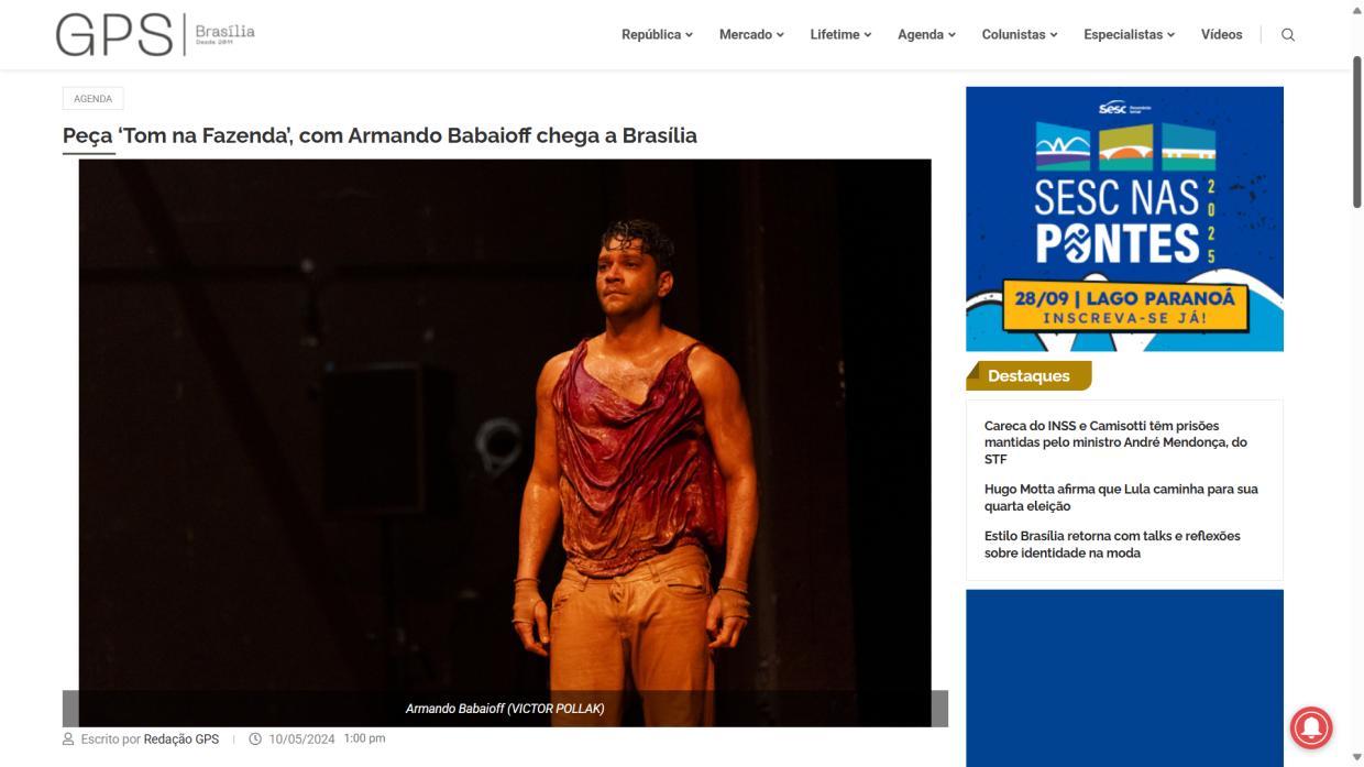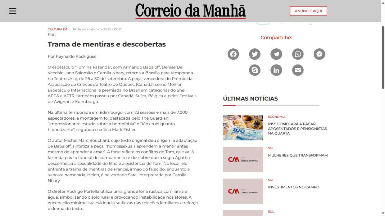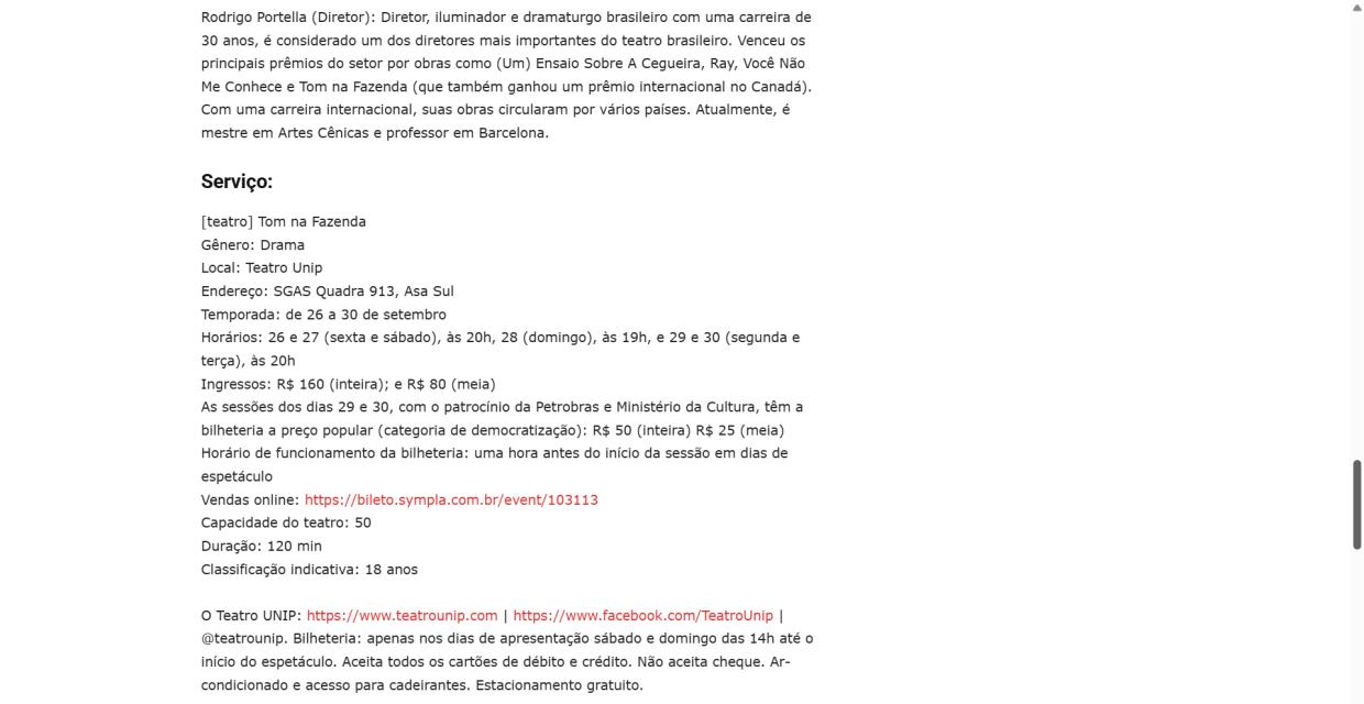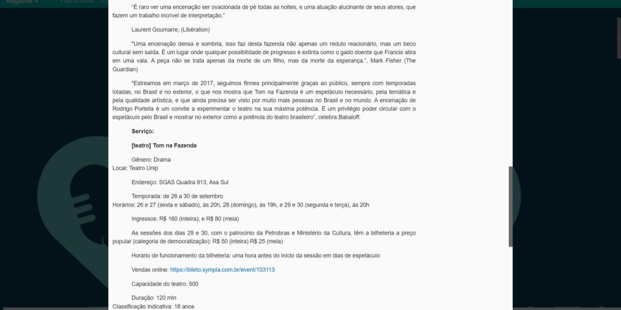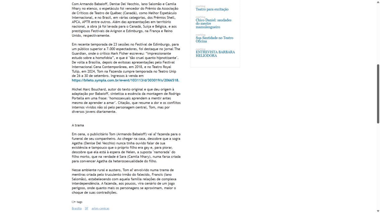 Em recente temporada de 23 sessões no Festival de Edimburgo, para um público superior a 7.000 espectadores, foi destaque no jornal The Guardian, onde o crítico Mark Fisher escreveu: “impressionante estudo sobre a homofobia”, e que é "tão cruel quanto hipnotizante". De volta a Brasília, depois de exitosas apresentações pelo Festival Internacional Cena Contemporânea, em 2018, e no Teatro Royal Tulip, em 2024, Tom na Fazenda cumpre temporada no Teatro Unip de 26 a 30 de setembro. Ingressos à venda em https://bileto.sympla.com.br/event/103113/d/303019/s/2066518.