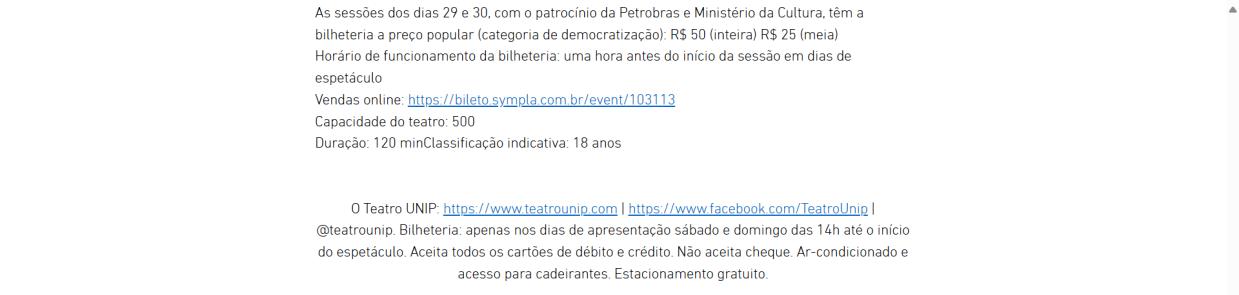 O Teatro UNIP: https://www.teatrounip.com | https://www.facebook.com/TeatroUnip | @teatrounip. Bilheteria: apenas nos dias de apresentação sábado e domingo das 14h até o início do espetáculo. Aceita todos os cartões de débito e crédito. Não aceita cheque. Arcondicionado e acesso para cadeirantes. Estacionamento gratuito.