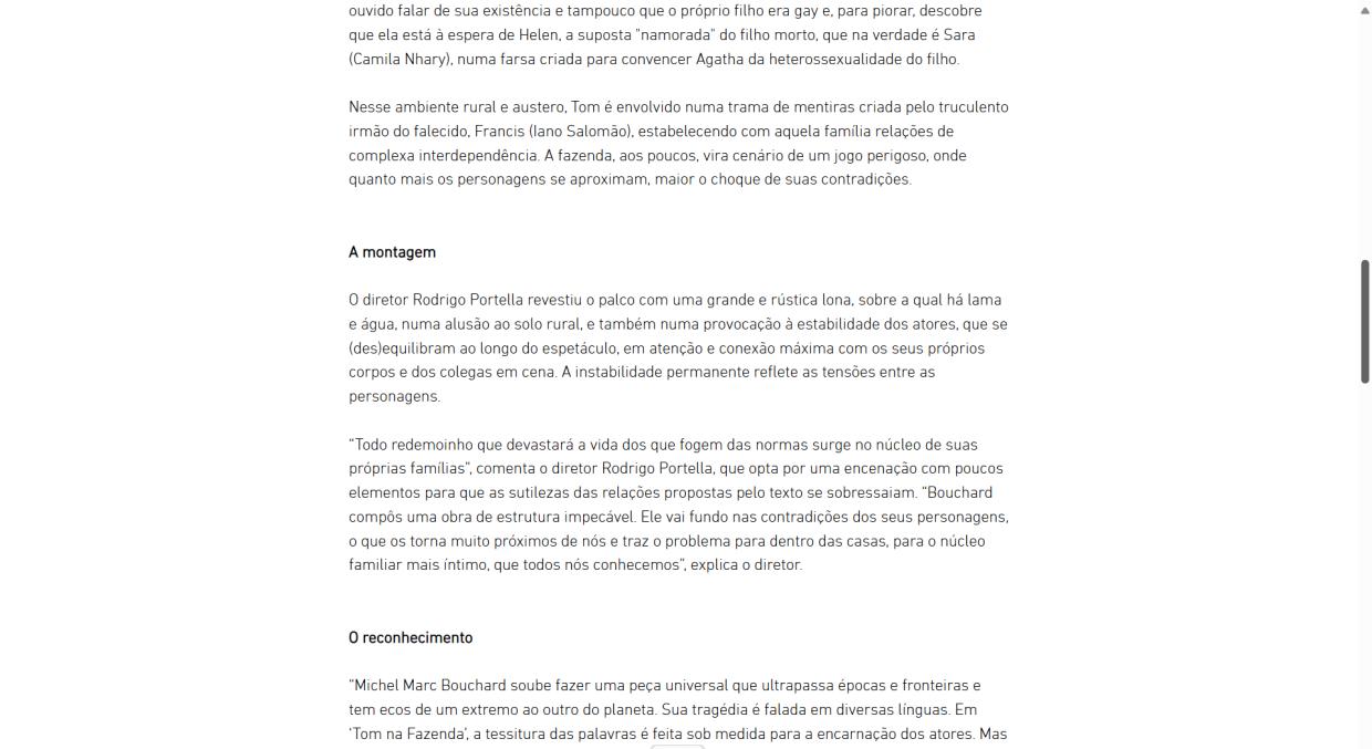 “Michel Marc Bouchard soube fazer uma peça universal que ultrapassa épocas e fronteiras e tem ecos de um extremo ao outro do planeta. Sua tragédia é falada em diversas línguas. Em ‘Tom na Fazenda’, a tessitura das palavras é feita sob medida para a encarnação dos atores. Mas no Théâtre Paris-Villette a interpretação exacerbava o texto. Tanto que a apropriação brasileira tem ares de reescrita. No entanto, este não é o caso.