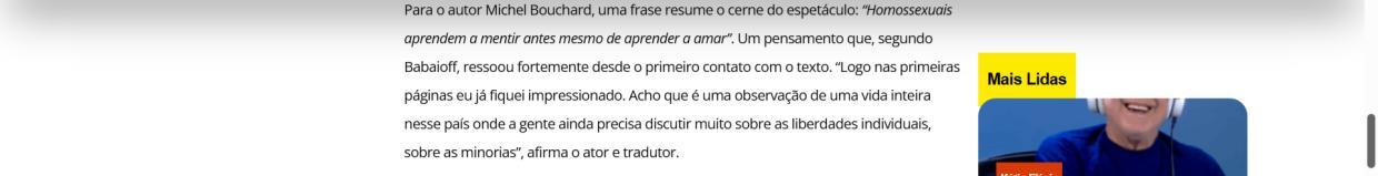 Michel Marc Bouchard, autor do texto original e que deu origem à adaptação por Babaioff, sintetiza a essência da montagem de Rodrigo Portella em uma frase: "homossexuais aprendem a mentir antes mesmo de aprender a amar". Citação, que resume a dor e os conflitos internos vividos não só pelo personagem central, Tom, mas por diversos jovens diariamente.