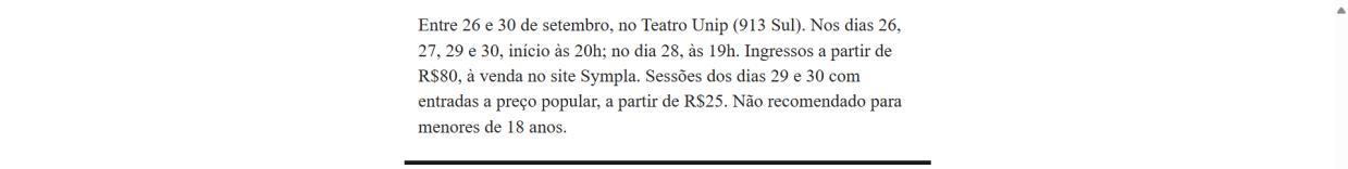 Horários: 26 e 27 (sexta e sábado), às 20h, 28 (domingo), às 19h, e 29 e 30 (segunda e terça), às 20h
