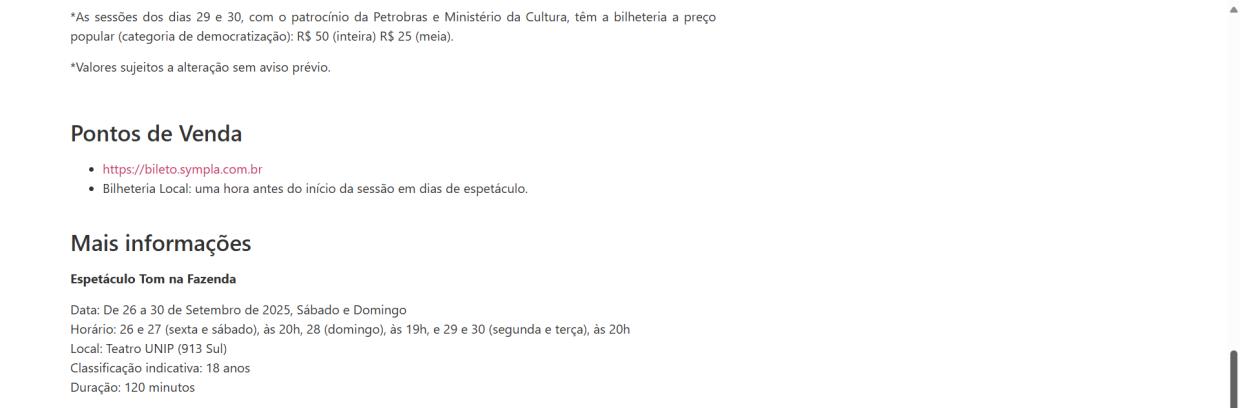 Horário de funcionamento da bilheteria: uma hora antes do início da sessão em dias de espetáculo