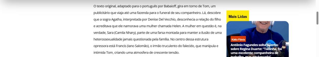 Em cena, o publicitário Tom (Armando Babaioff) vai à fazenda para o funeral de seu companheiro. Ao chegar na casa, descobre que a sogra Agatha (Denise Del Vecchio) nunca tinha ouvido falar de sua existência e tampouco que o próprio filho era gay e, para piorar, descobre que ela está à espera de Helen, a suposta "namorada" do filho morto, que na verdade é Sara (Camila Nhary), numa farsa criada para convencer Agatha da heterossexualidade do filho