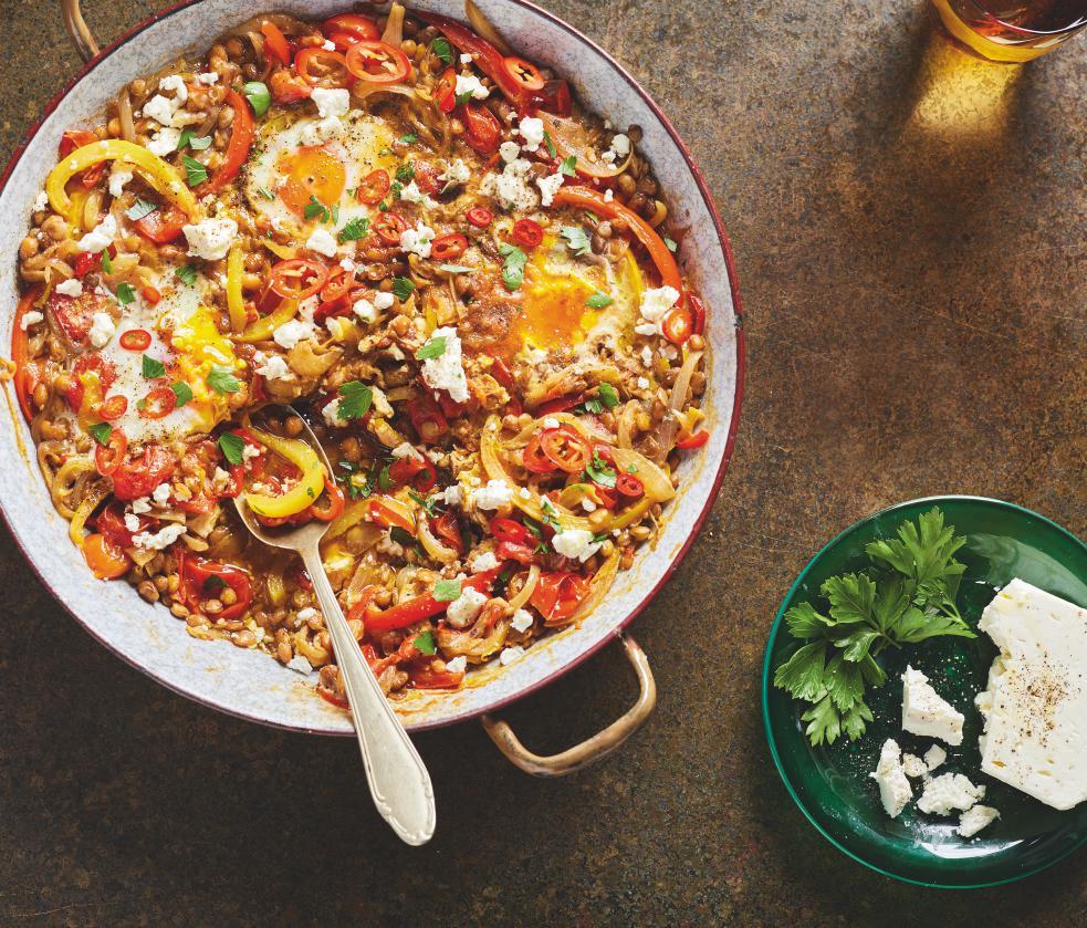with a tin of lentils, juices and all. Stir, season with sea salt and black pepper, cover, turn down the heat and simmer for 15 mins, or until thick and saucy. Make wells in the mixture and crack in eggs, then cover again and simmer for 5 mins or until the eggs are cooked to your liking. Crumble over some feta cheese, sprinkle over some more chilli and chopped parsley leaves. Delicious with crusty bread and a mixed salad.