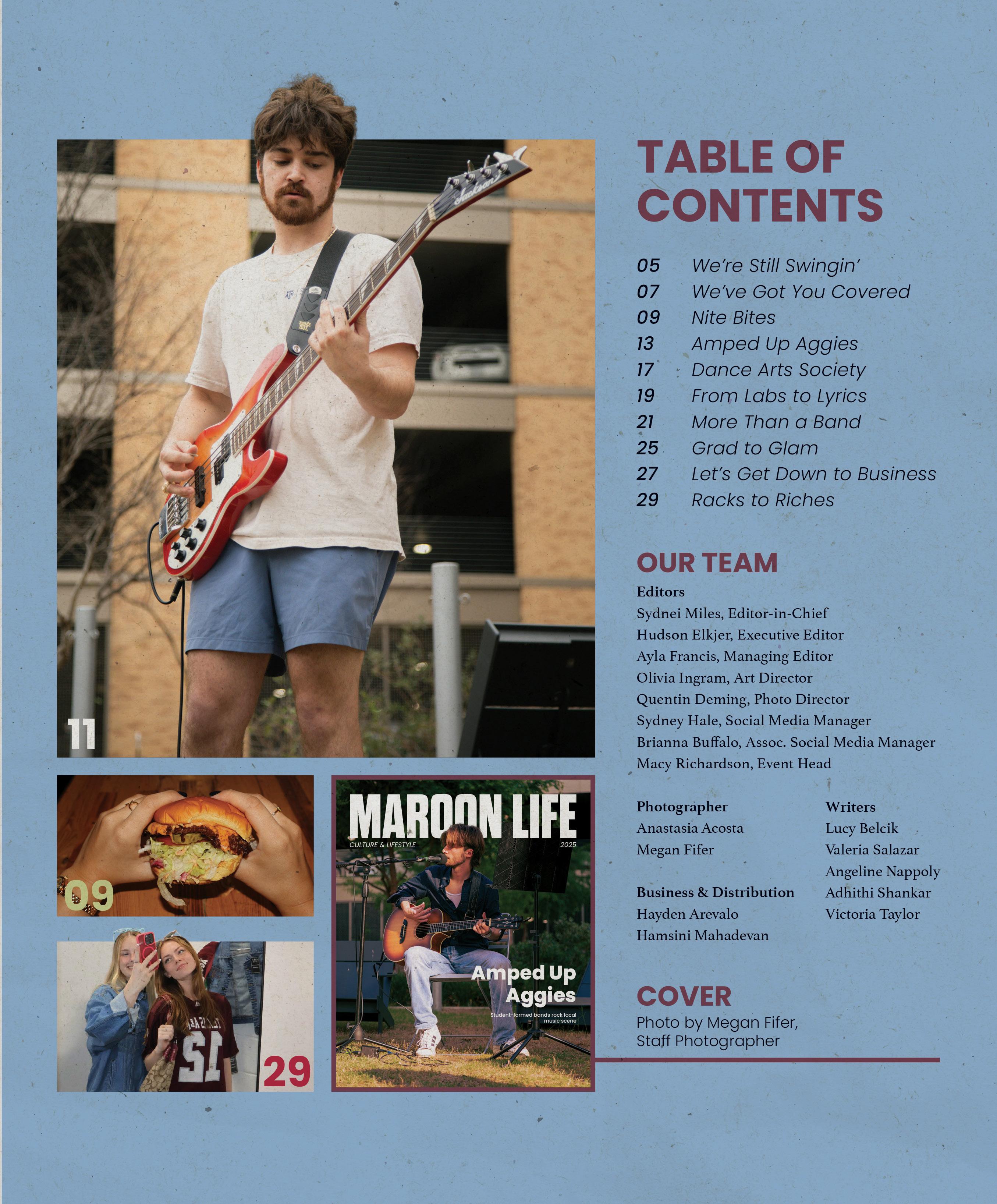 Porterfield Casey had no idea what lay ahead when he met kinesiology senior Jakob Smith and electrical engineering senior Michael Timinsky in Texas A&M SLAM, or sophomores leading and motivating. Bonding over a shared love of “jamming out,” the original three members started up playing in Smith’s room. A few others would sometimes show to casually play, but it all began with those three in a room covered corner to corner with posters — of course, where the name of the band was formed.