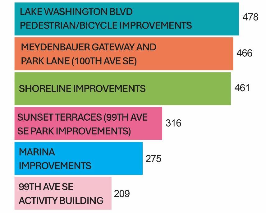 99th Ave SE: 99th Ave SE will continue to be the primary access for Pier 1 and the beach. 99th Ave SE remains as it was modified during Phase 1 park construction, but the adjacent corner of the park will evolve. Based on 2023/2024 community input, modest park amenity improvements are proposed. Because shoreline parking will be reduced, 99th Ave SE will receive less traffic than it does in the 2025 condition.